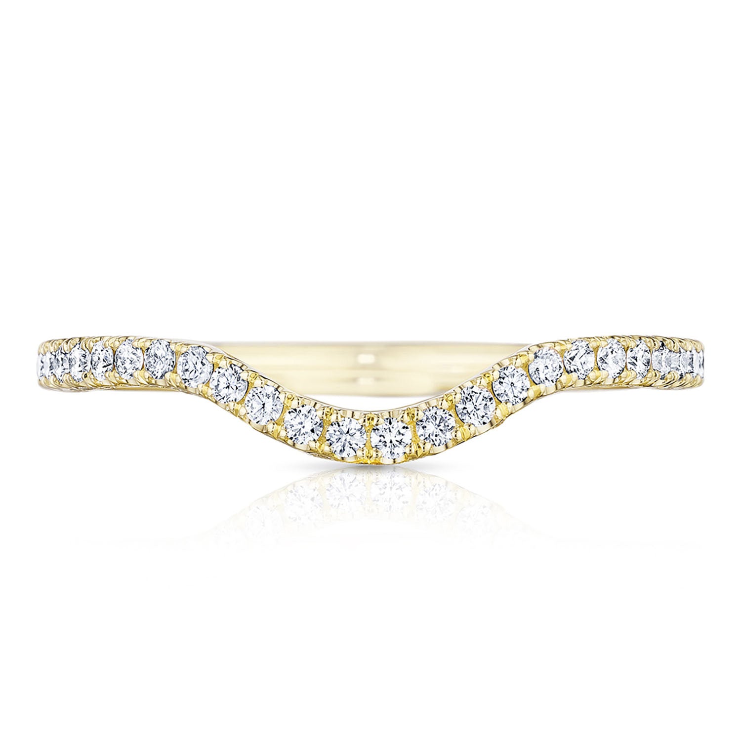 "Wave hello to our newest wedding band shape, sure to fit the Tacori Bride who's looking for a unique and unconventional twist to the traditional wedding band. pavé set diamonds curve halfway round a 18kt Rose Gold band. Worn delicately underneath your engagement ring or on top for dramatic effect, this curved ladies band truly bends the rule in wedding style."