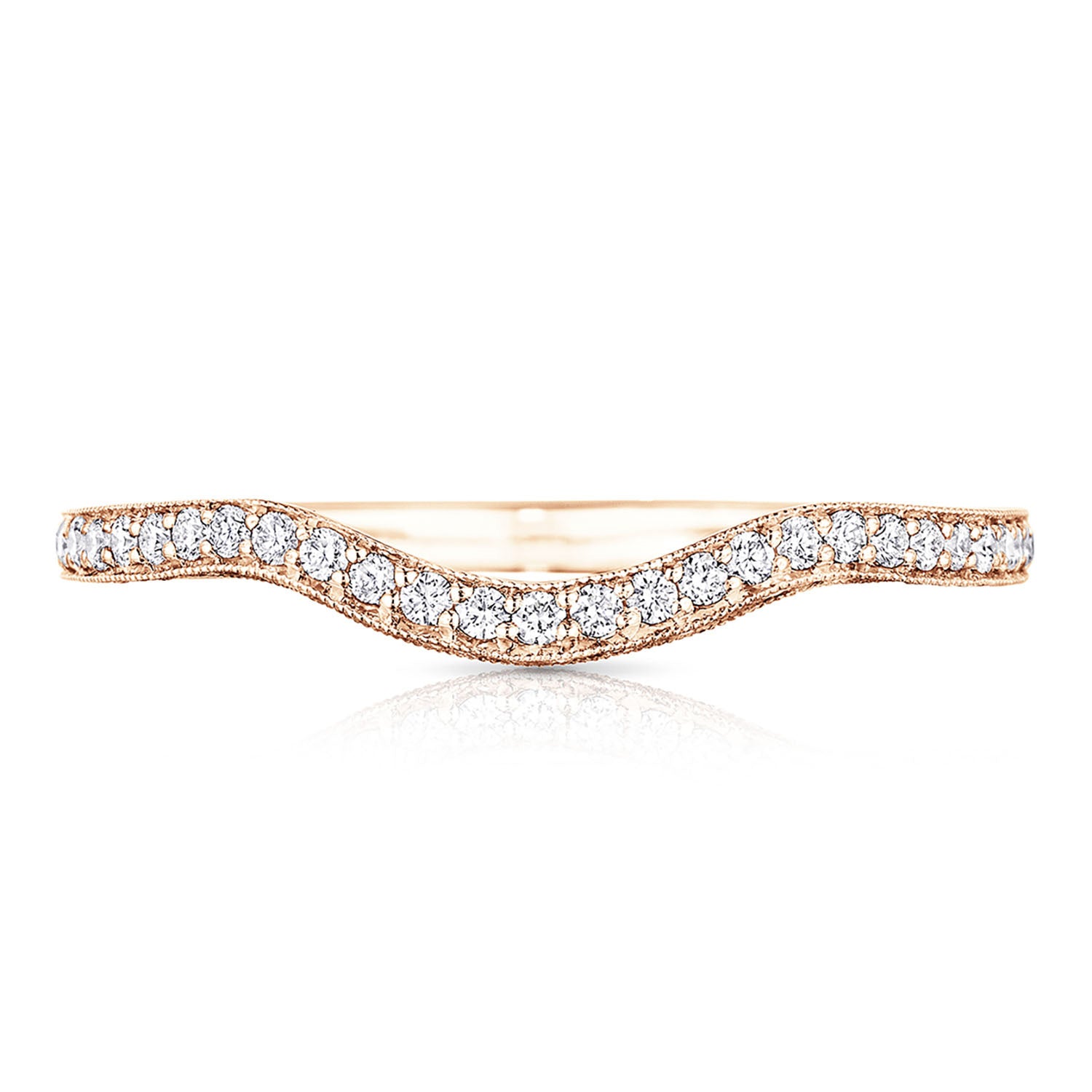 "Wave hello to our newest wedding band shape, sure to fit the Tacori Bride who's looking for a unique and unconventional twist to the traditional wedding band. pavé set diamonds curve halfway round a platinum and diamond band. Worn delicately underneath your engagement ring or on top for dramatic effect, this curved ladies band truly bends the rule in wedding style."