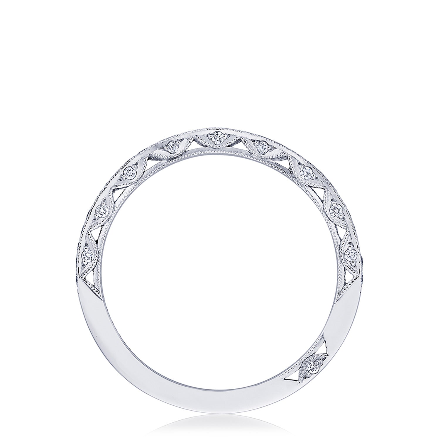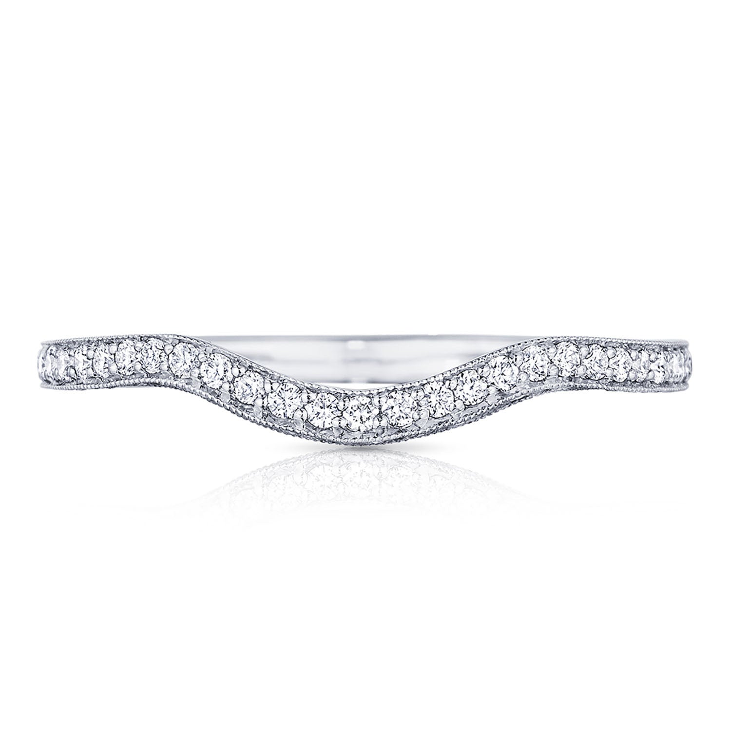 "Wave hello to our newest wedding band shape, sure to fit the Tacori Bride who's looking for a unique and unconventional twist to the traditional wedding band. pavé set diamonds curve halfway round a platinum and diamond band. Worn delicately underneath your engagement ring or on top for dramatic effect, this curved ladies band truly bends the rule in wedding style."