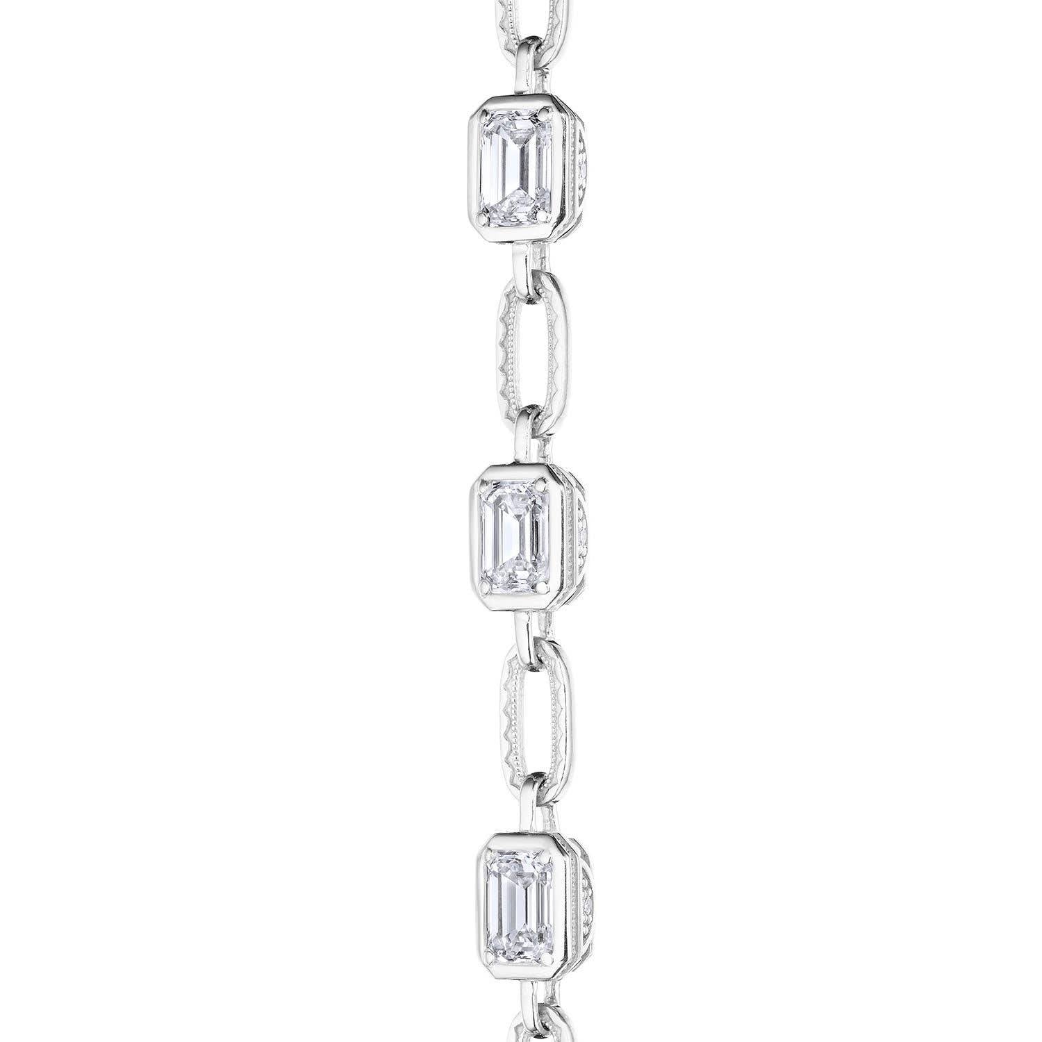 "High polish frames enthrall mined diamond centers, while on the reverse, meticulous hidden details and pinpoint mined diamonds add dimensional sparkle. Hand-hewn Crescent-embellished links connect each bezel setting."