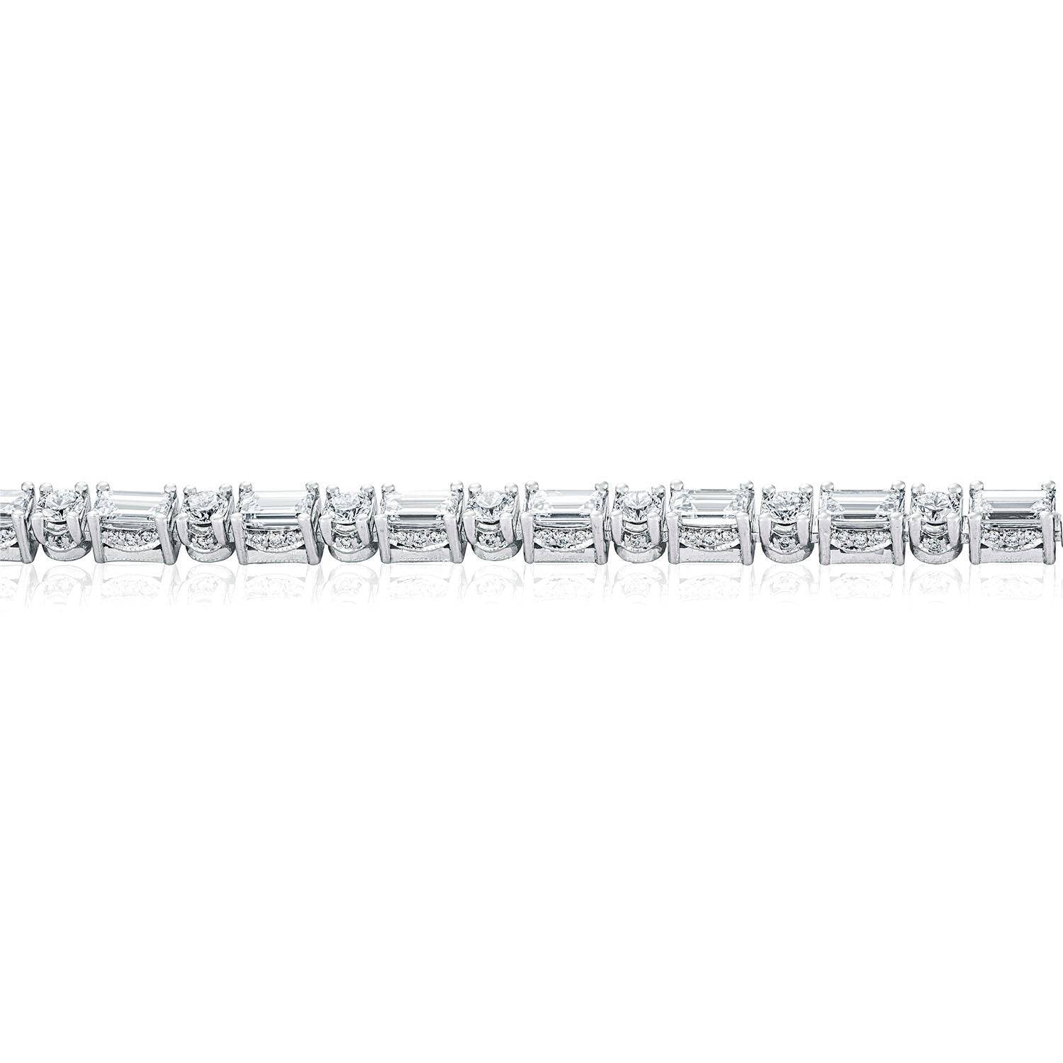 An 18 Karat White Gold chain is meticulously hand set with a full 11.3 Carats of alternating baguette and round brilliant diamonds.