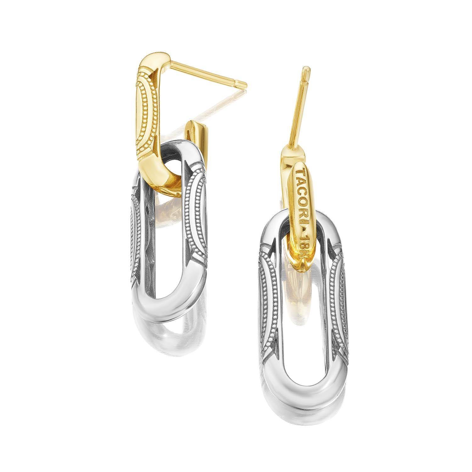Two delicate links, one 18 Karat Yellow Gold and one 18 Karat White Gold, are embellished with hand-hewn milgrian and a high polish finish.