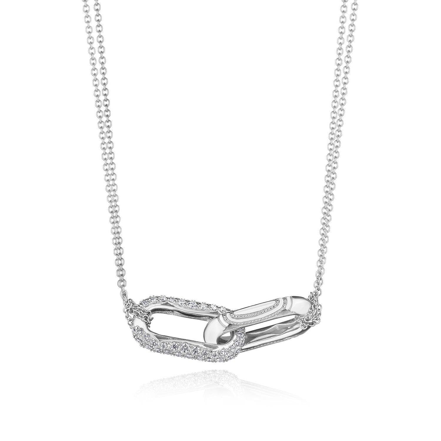 A diamond-studded 18 Karat White Gold link is interconnected with a meticulously milgrain-embellished 18 Karat White Gold link.