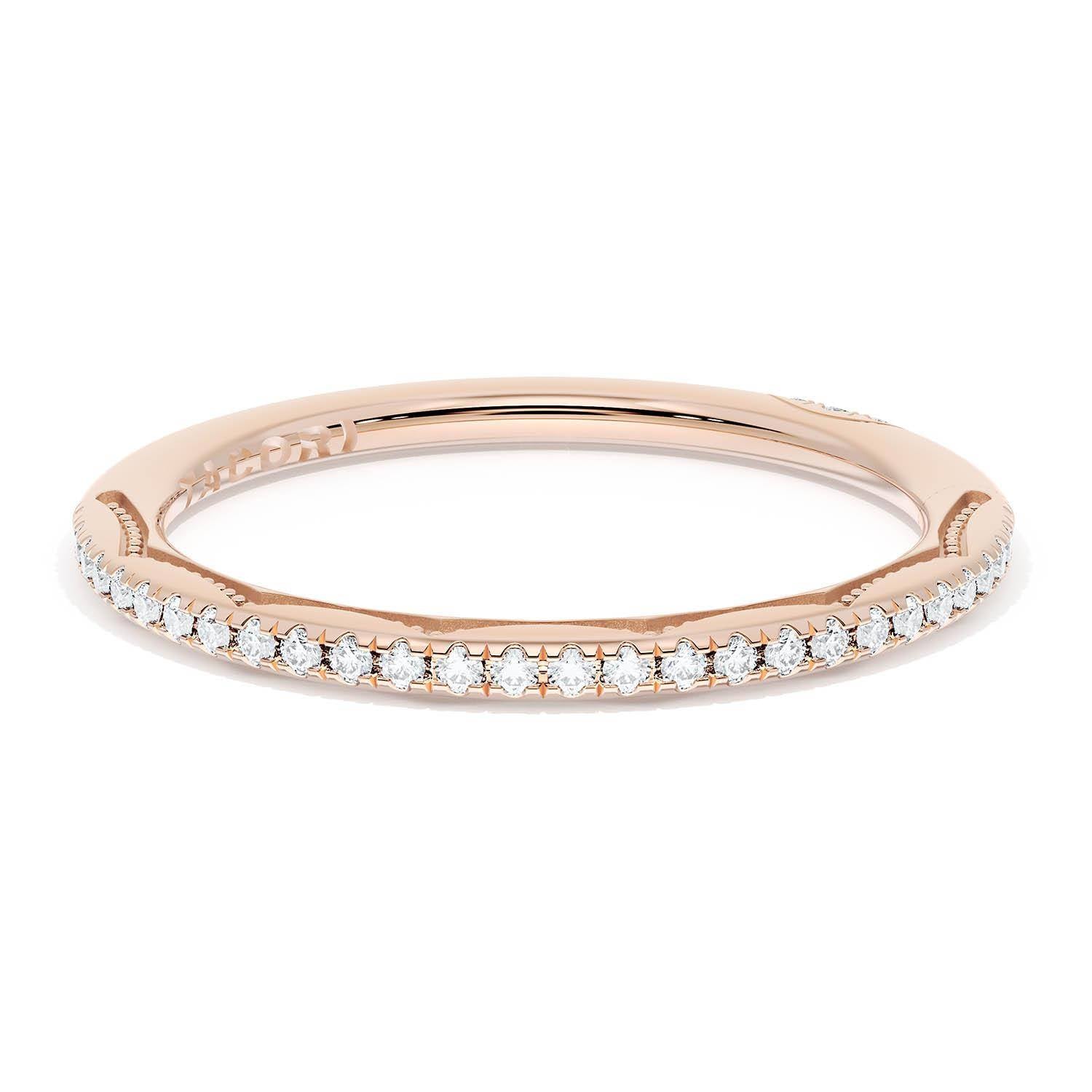 Alternating carré and round brilliant diamonds are bezel set into a high polish 18kt Rose Gold band. Hand-hewn beading and meticulous milgrain add texture to the inner face silhouette.