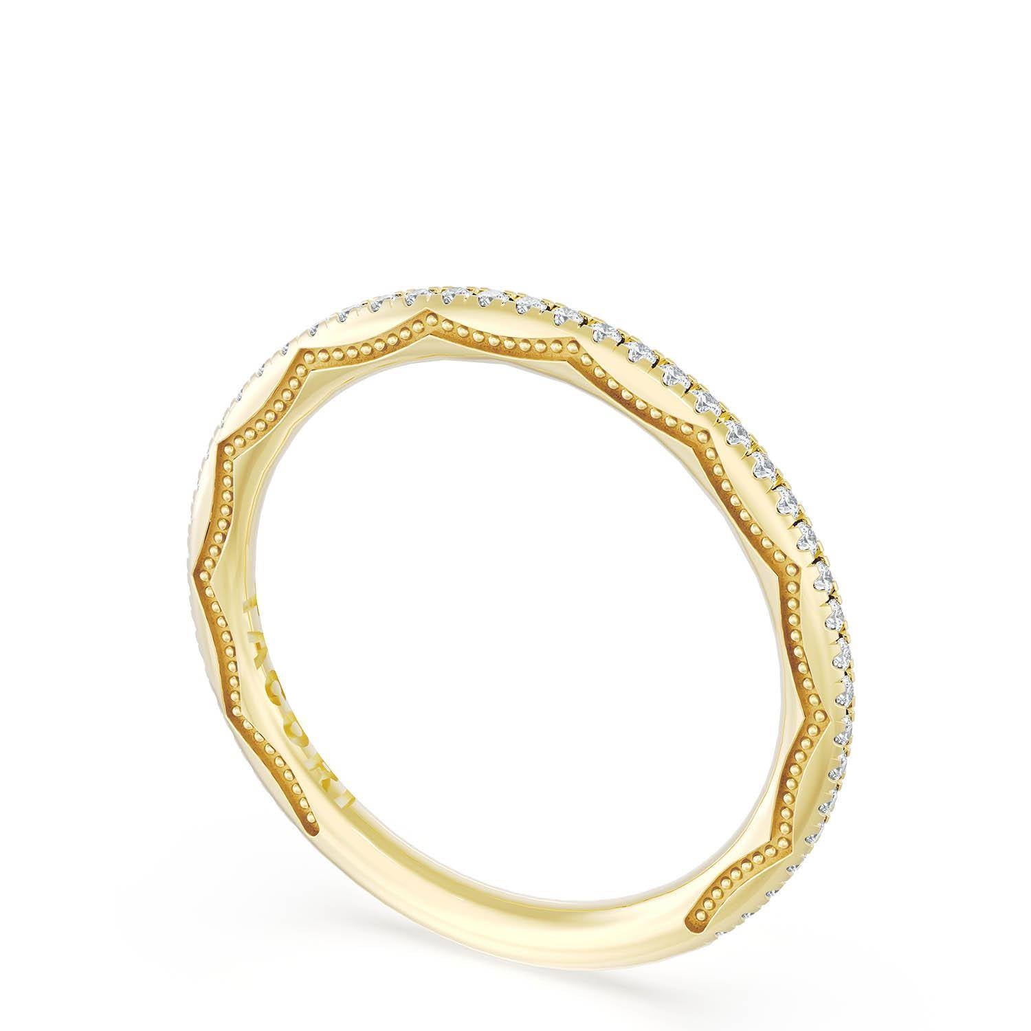 Alternating carré and round brilliant diamonds are bezel set into a high polish 18kt Yellow Gold band. Hand-hewn beading and meticulous milgrain add texture to the inner face silhouette.