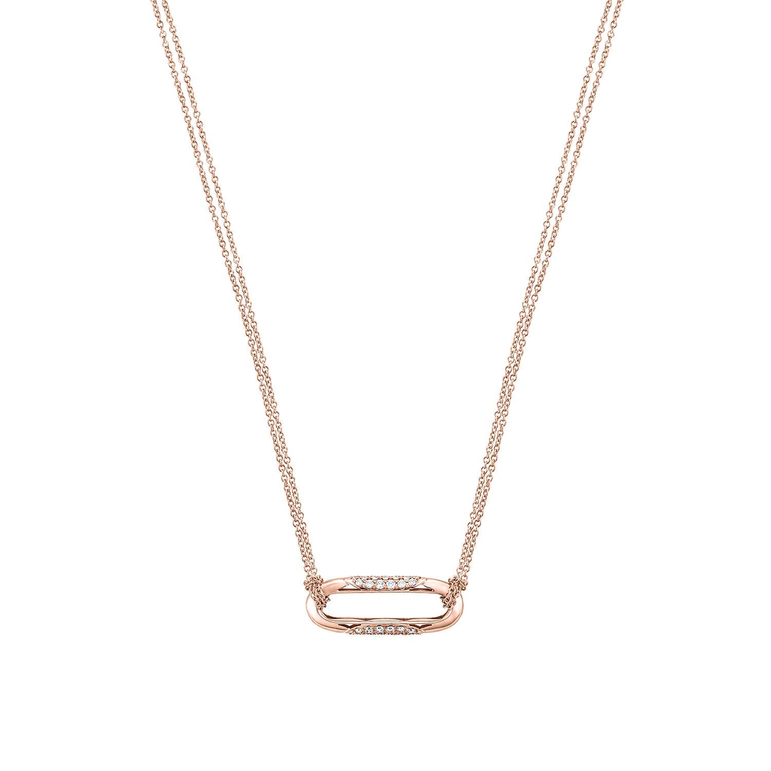"An 18k gold link is meticulously hand set with an ellipse pattern of round brilliant Diamonds. The link hangs horizontally from a delicate double-cable chain, displaying truly Tacori details in a contemporary silhouette."