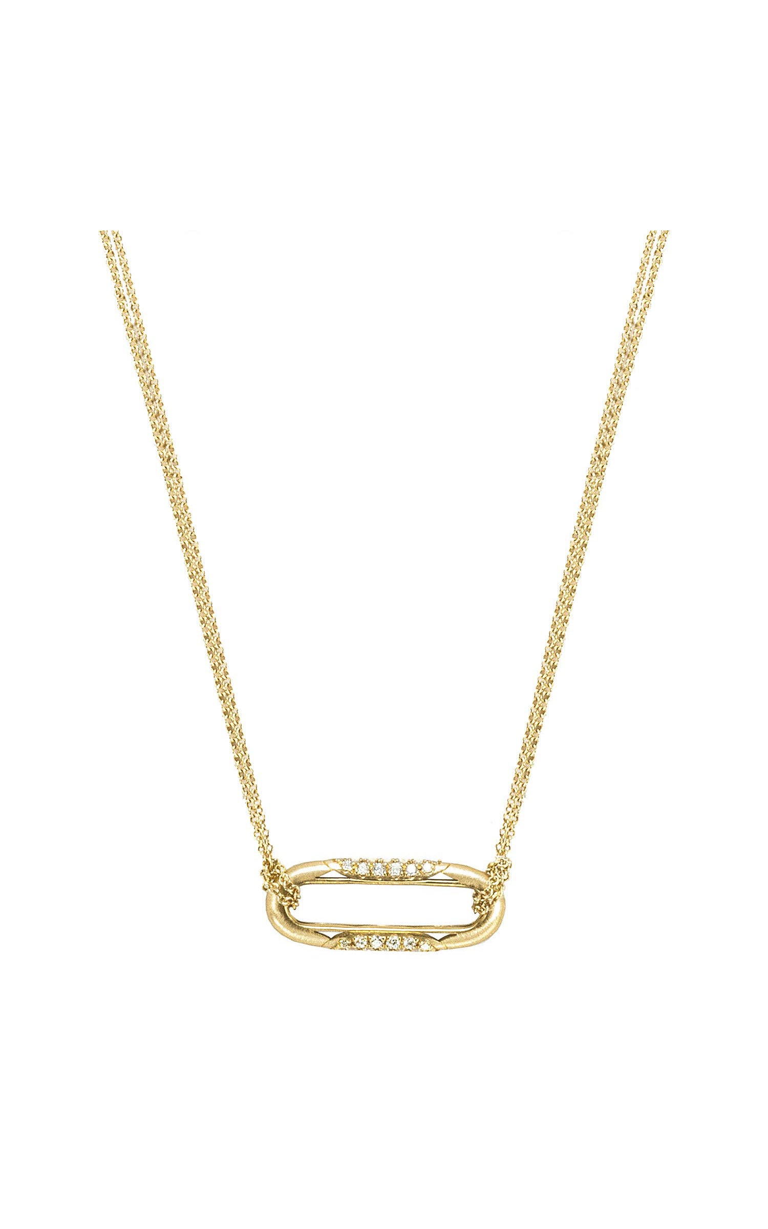 "An 18k gold link is meticulously hand set with an ellipse of sparkling round-brilliant Diamonds. The link hangs horizontally from a delicate double-cable chain, displaying truly TACORI details in a bold and contemporary silhouette."