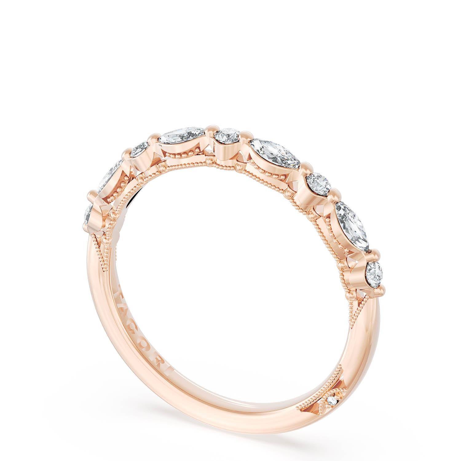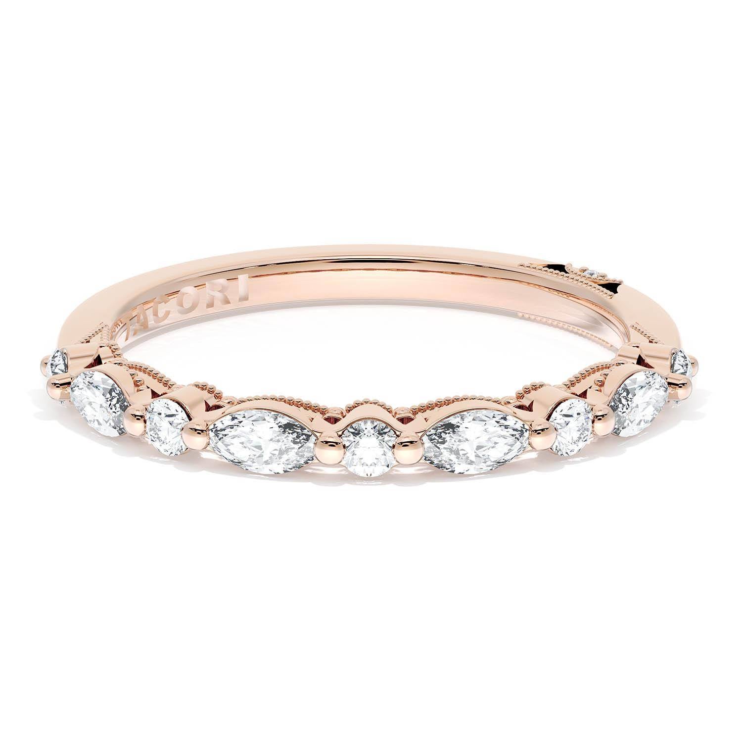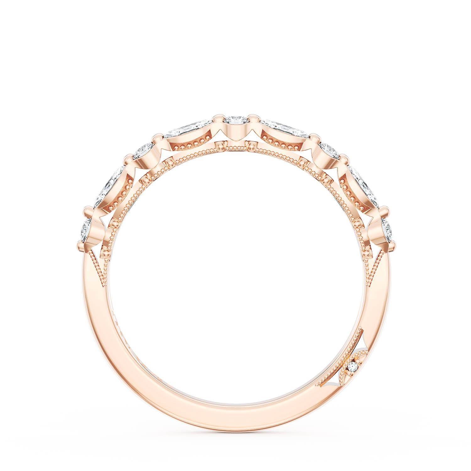 Alternating marquise and round brilliant diamonds are bezel set into a high polish 18kt Rose Gold band. Hand-hewn beading and meticulous milgrain add texture to the inner face silhouette.