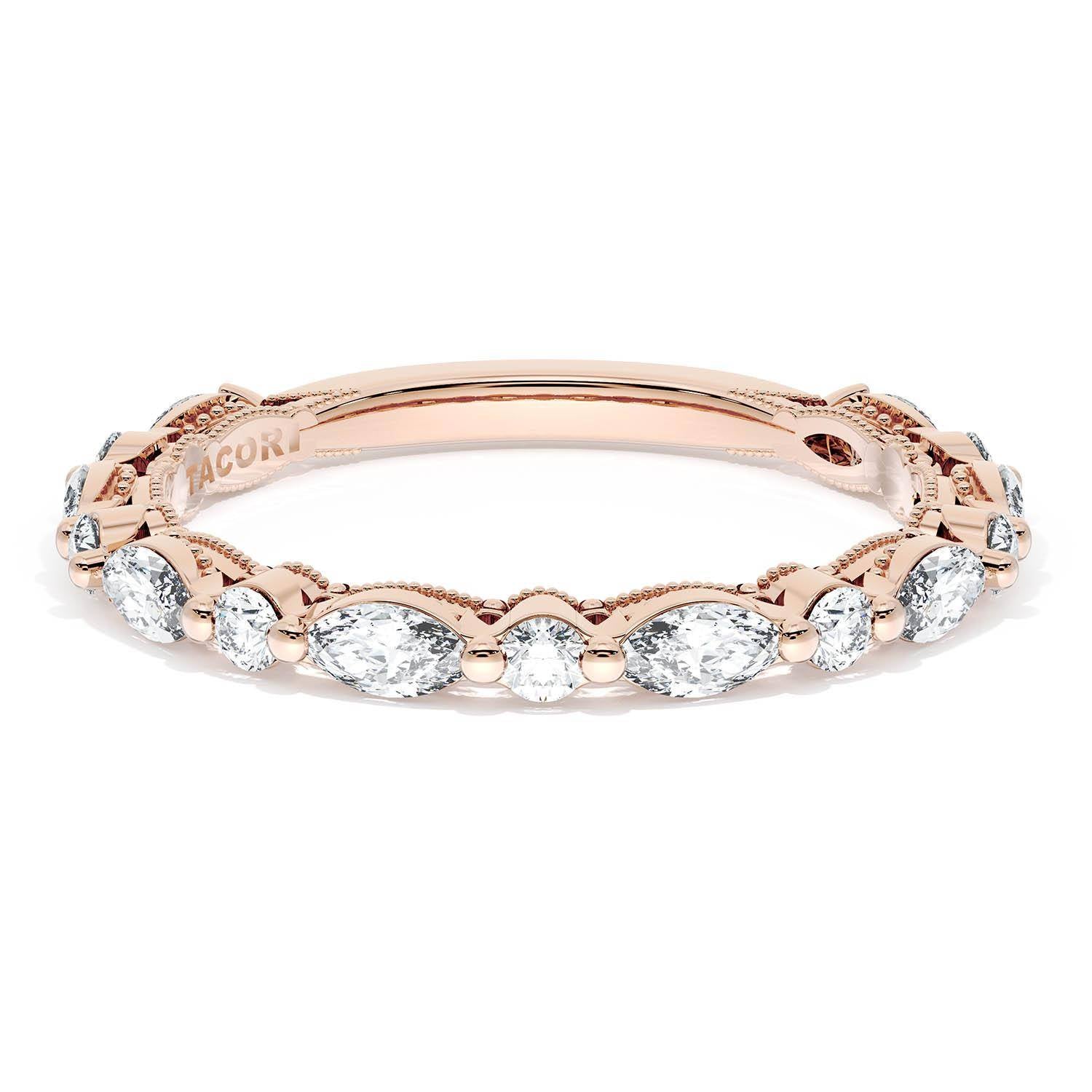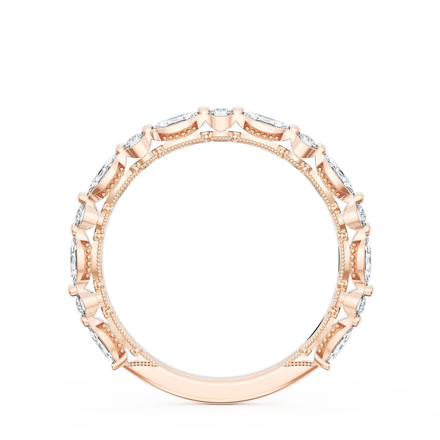 Alternating marquise and round brilliant diamonds are bezel set into a high polish 18kt Rose Gold band. Hand-hewn beading and meticulous milgrain add texture to the inner face silhouette.