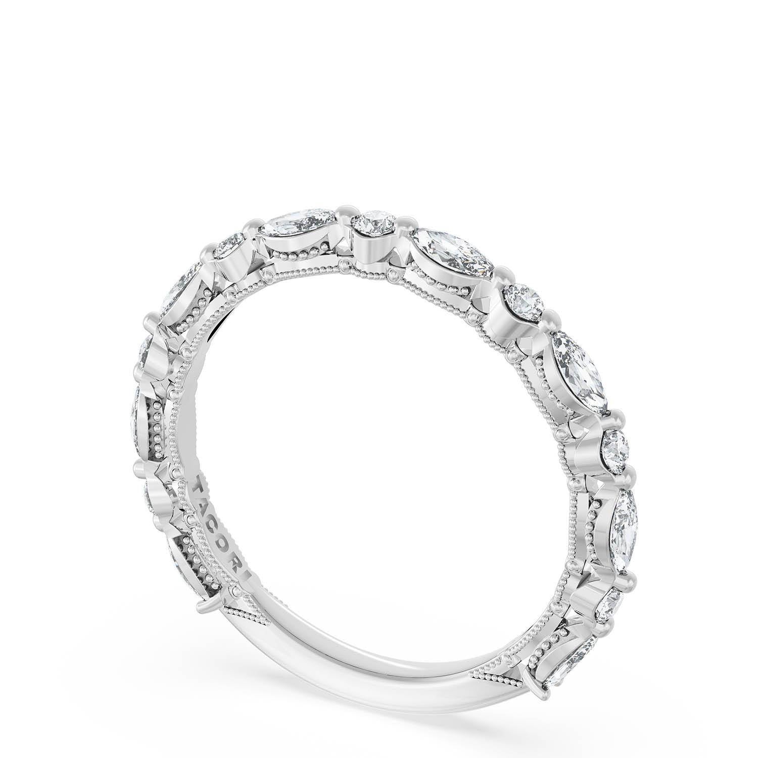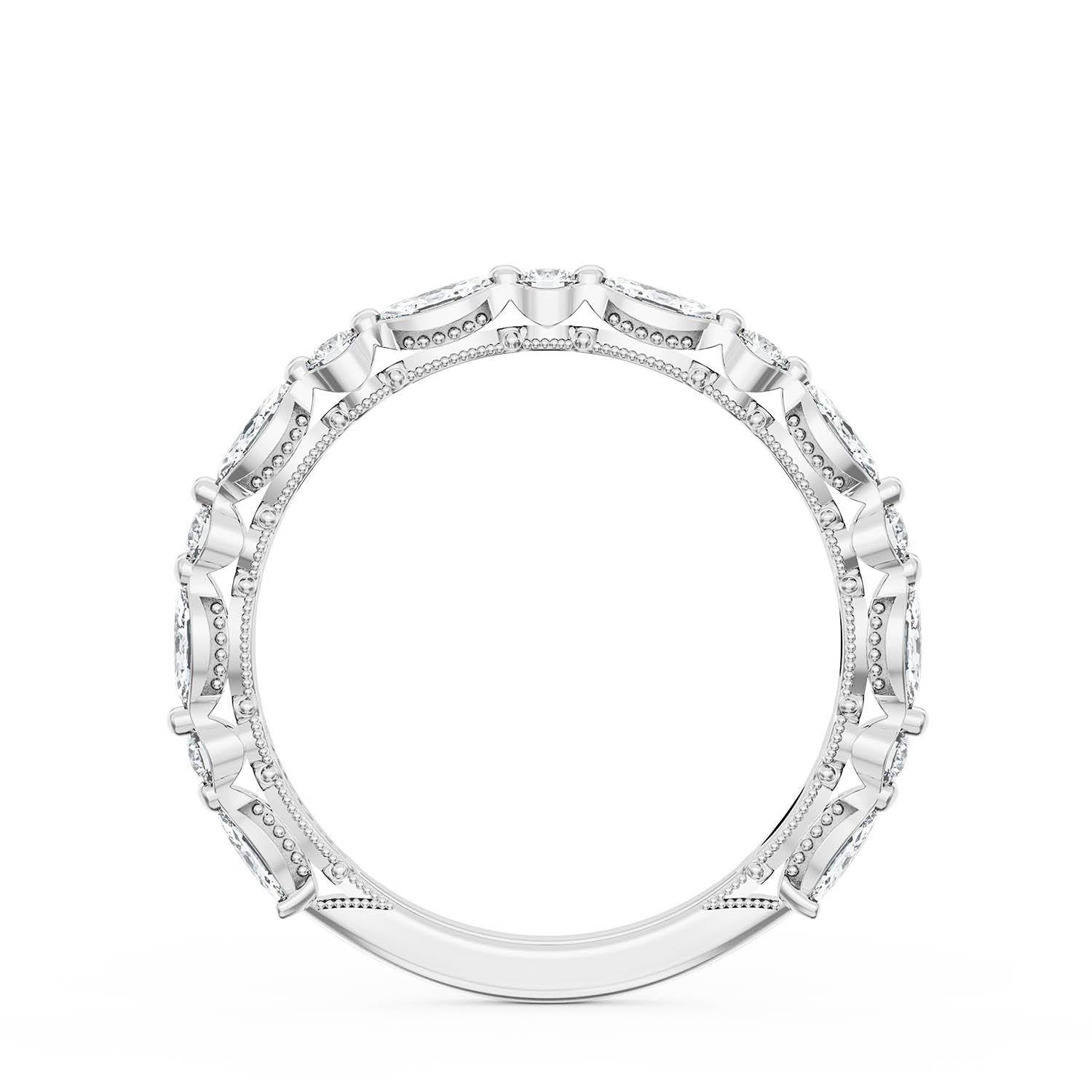 Alternating marquise and round brilliant diamonds are bezel set into a high polish 18kt White Gold band. Hand-hewn beading and meticulous milgrain add texture to the inner face silhouette.