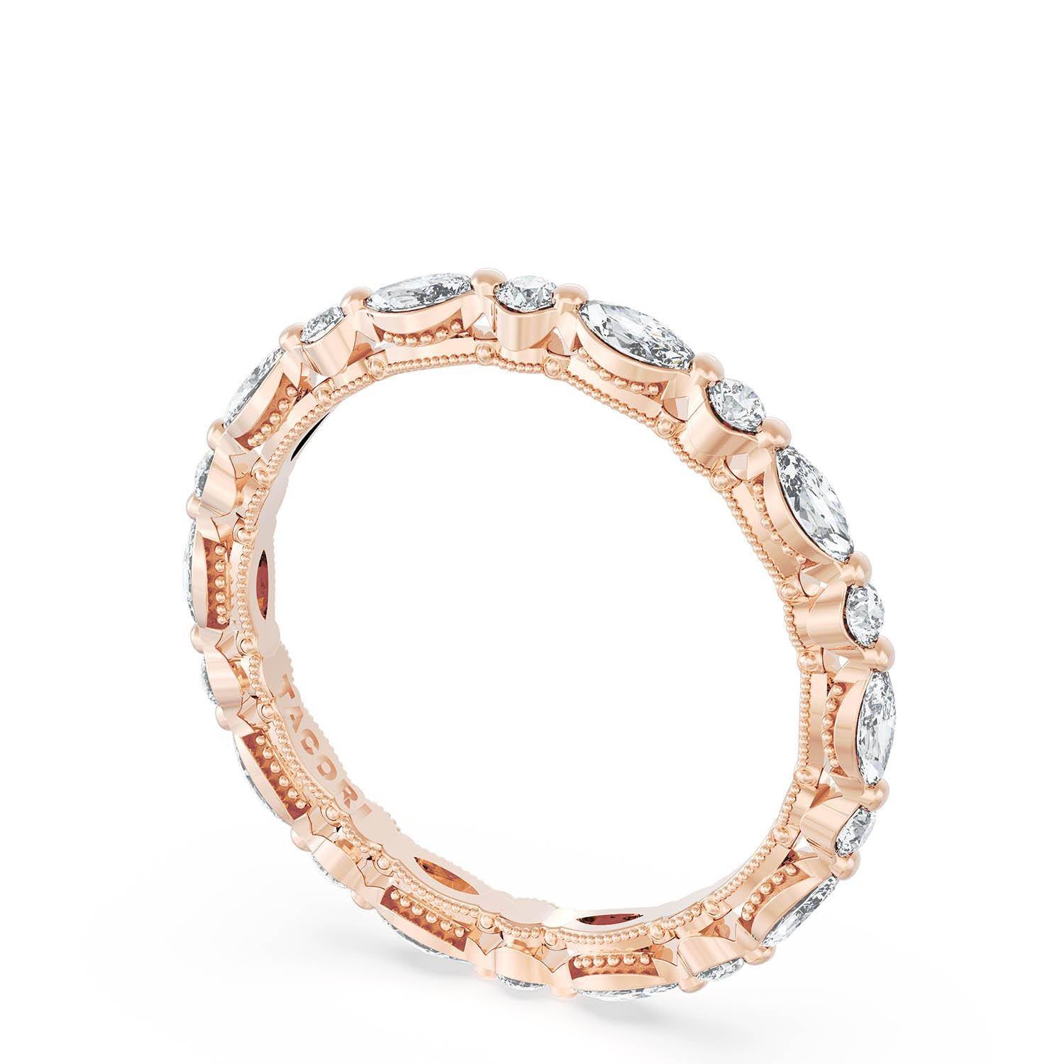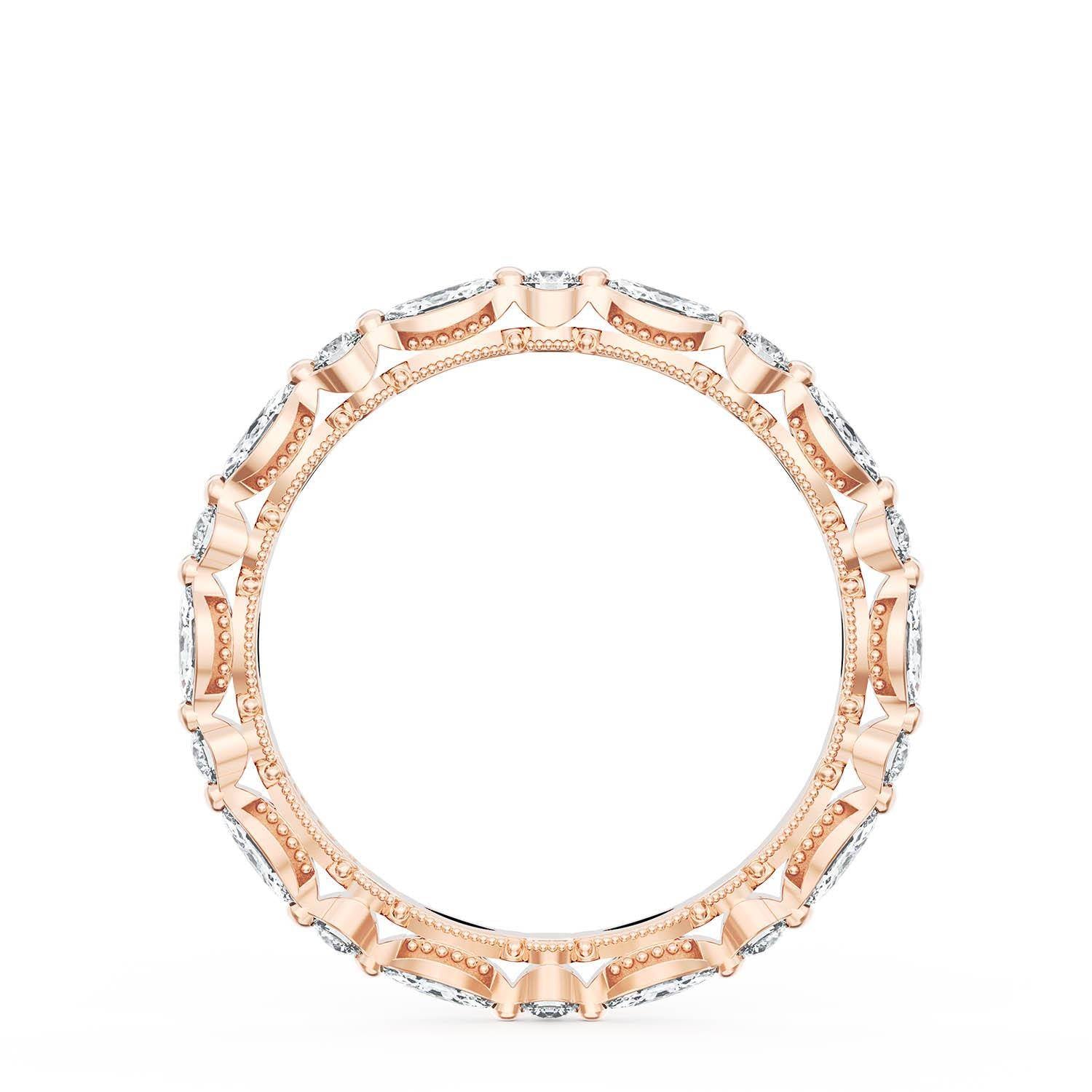 Alternating marquise and round brilliant diamonds are bezel set into a high polish 18kt Rose Gold band. Hand-hewn beading and meticulous milgrain add texture to the inner face silhouette.