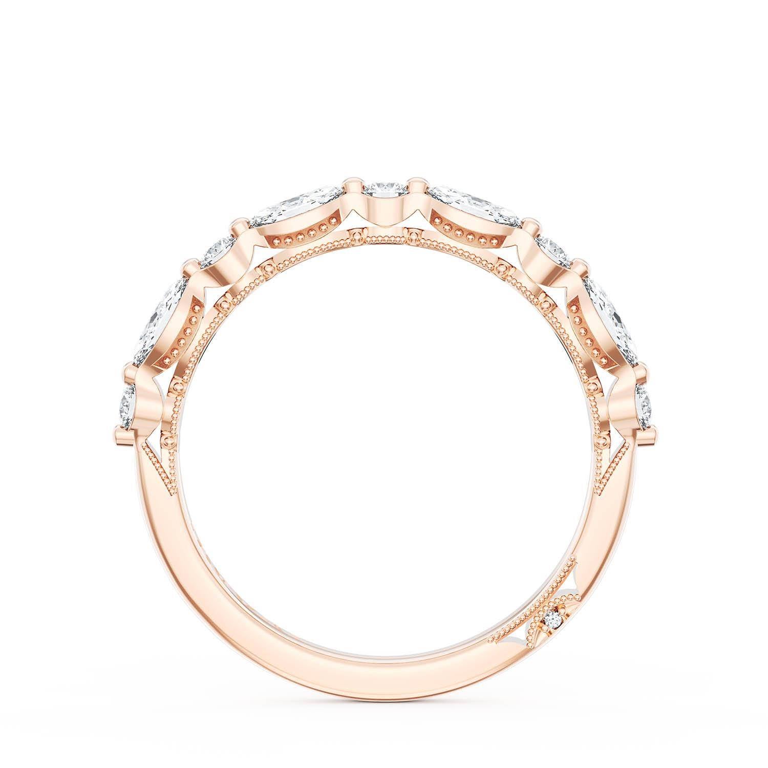 Alternating marquise and round brilliant diamonds are bezel set into a high polish 18kt Rose Gold band. Hand-hewn beading and meticulous milgrain add texture to the inner face silhouette.