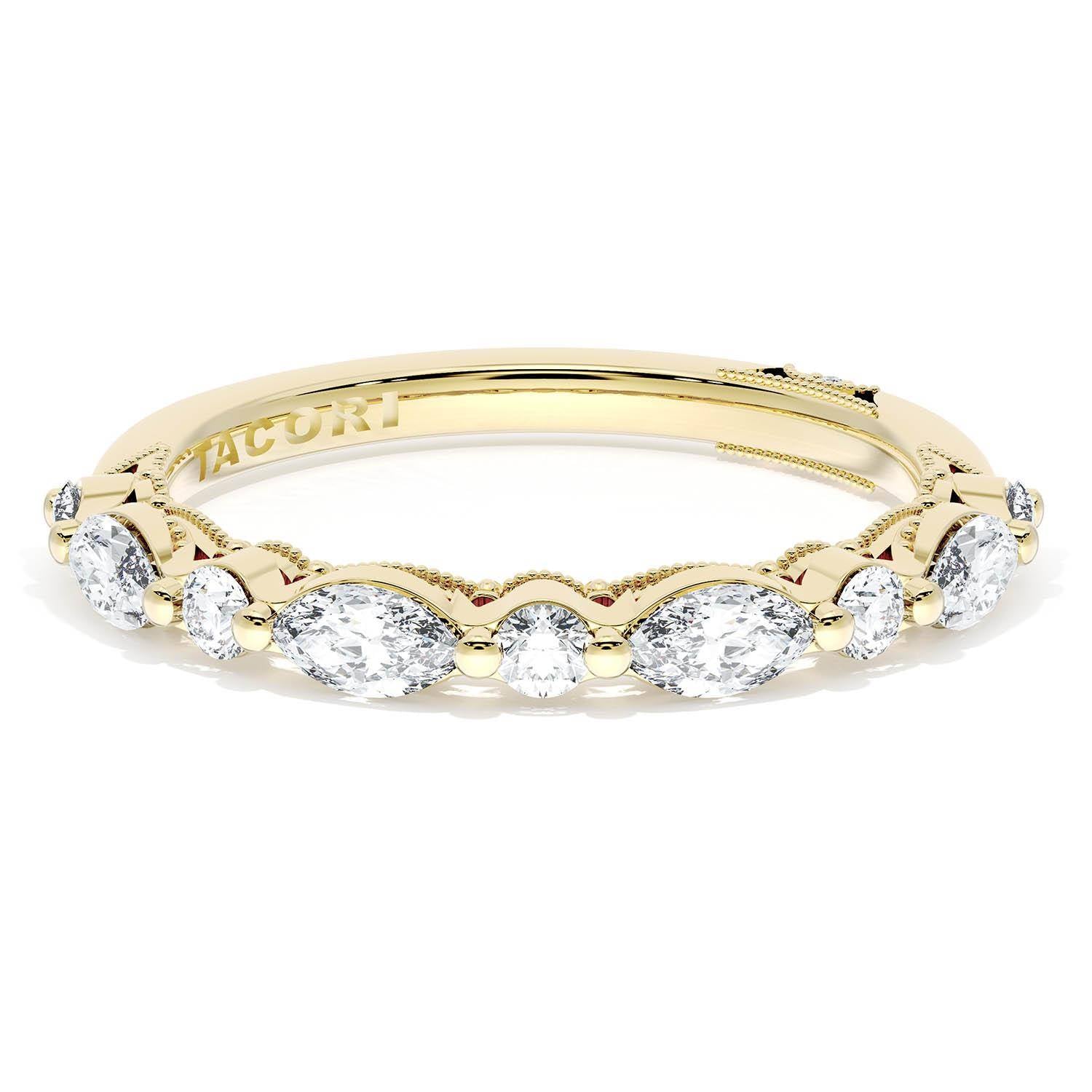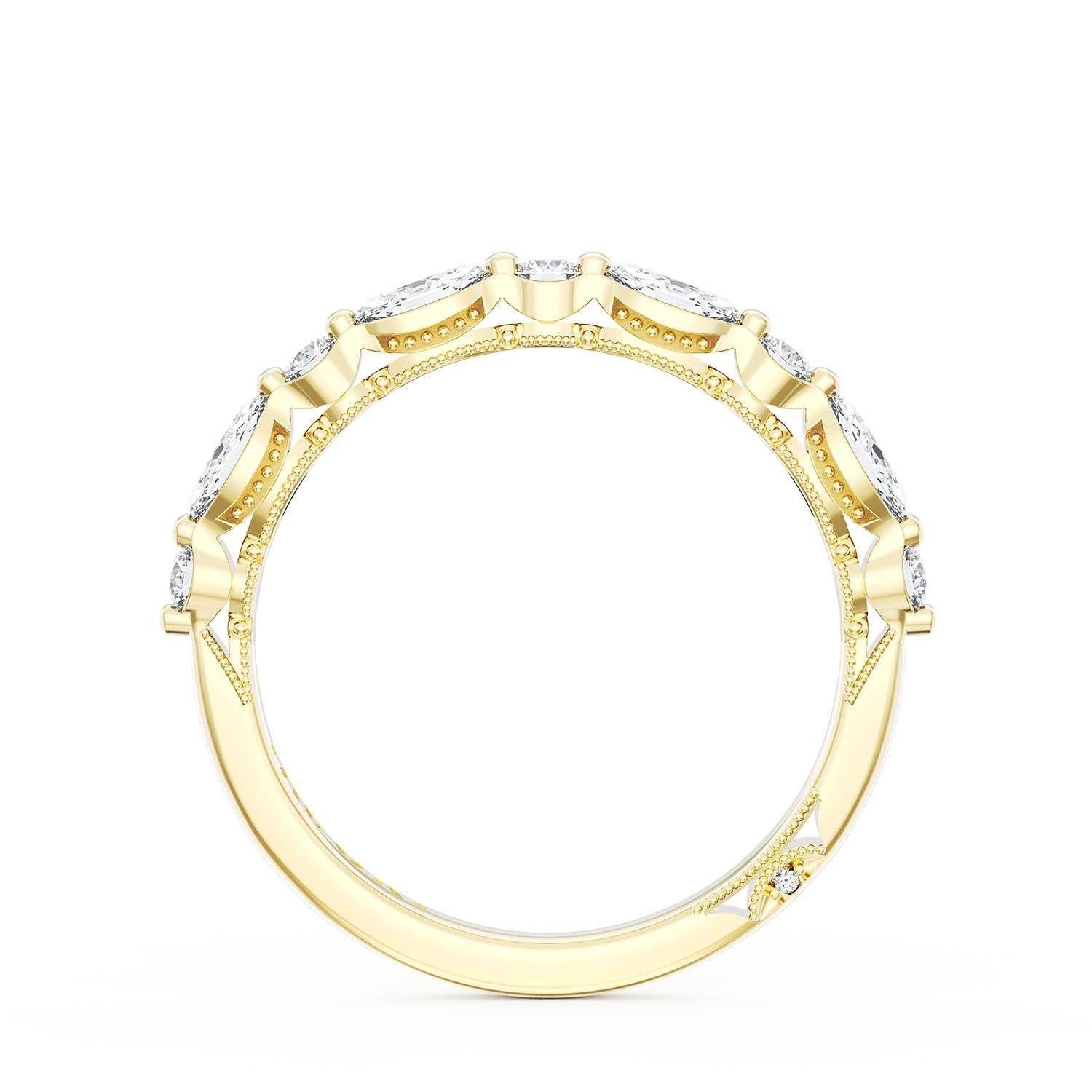 Alternating marquise and round brilliant diamonds are bezel set into a high polish 18kt Yellow Gold band. Hand-hewn beading and meticulous milgrain add texture to the inner face silhouette.