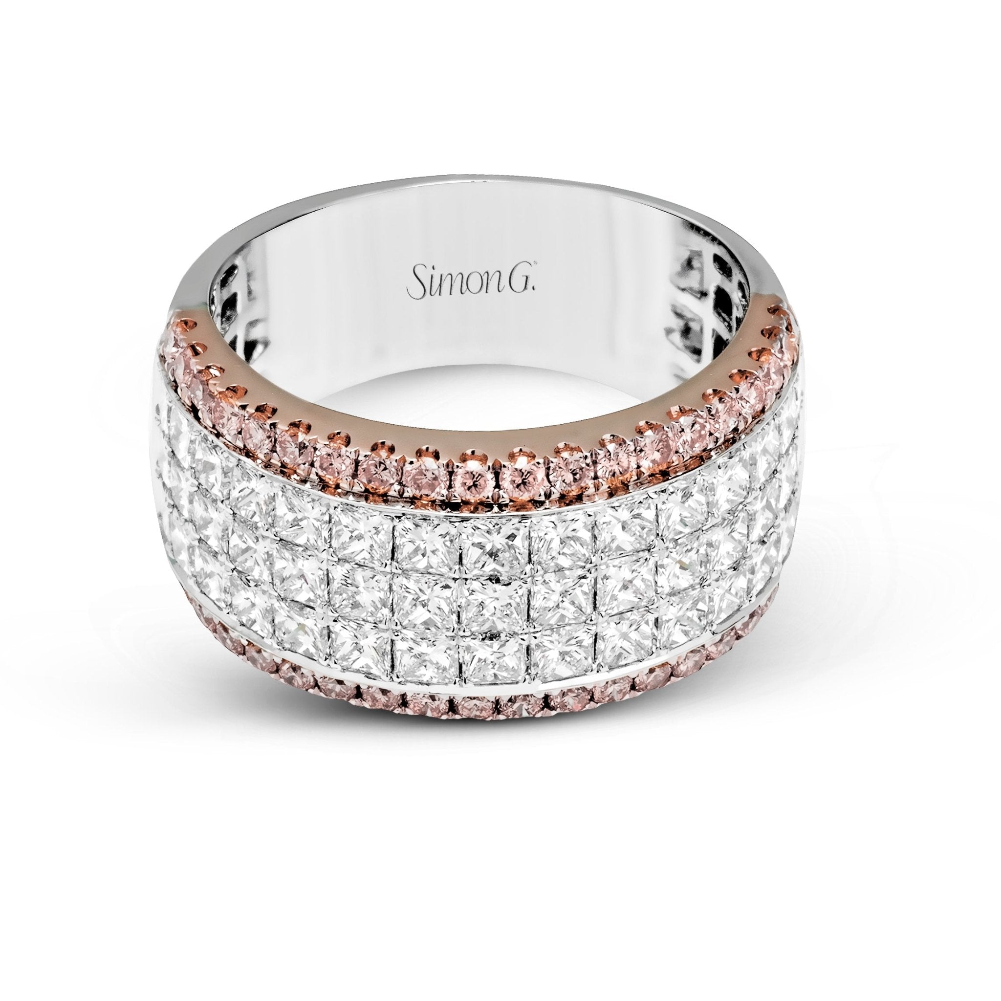 This wonderful ring is crafted with our patented design technique and makes quite a statement with a dazzling array of brilliant pink and white diamonds.