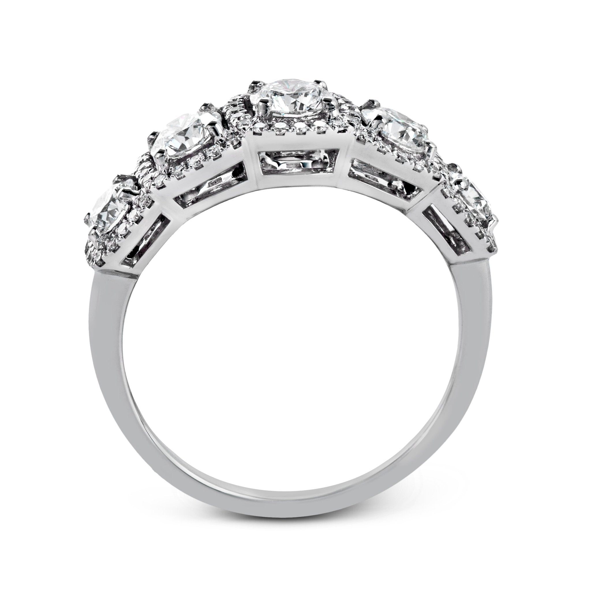This eye-catching band features a modern design and exquisite halos set with glistening white diamond accents.
