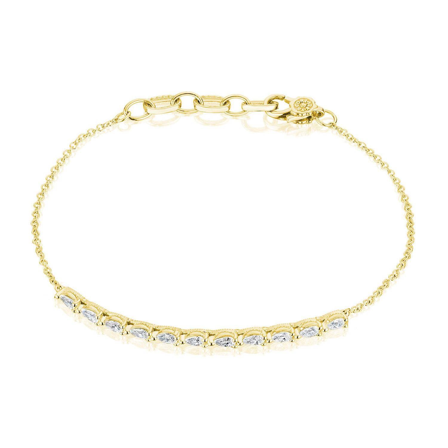 Pear cut diamonds glimmer on a delicate chain of 18k Yellow Gold. Milgrain-accented TACORI Crescent detailing decorates the silhouette.