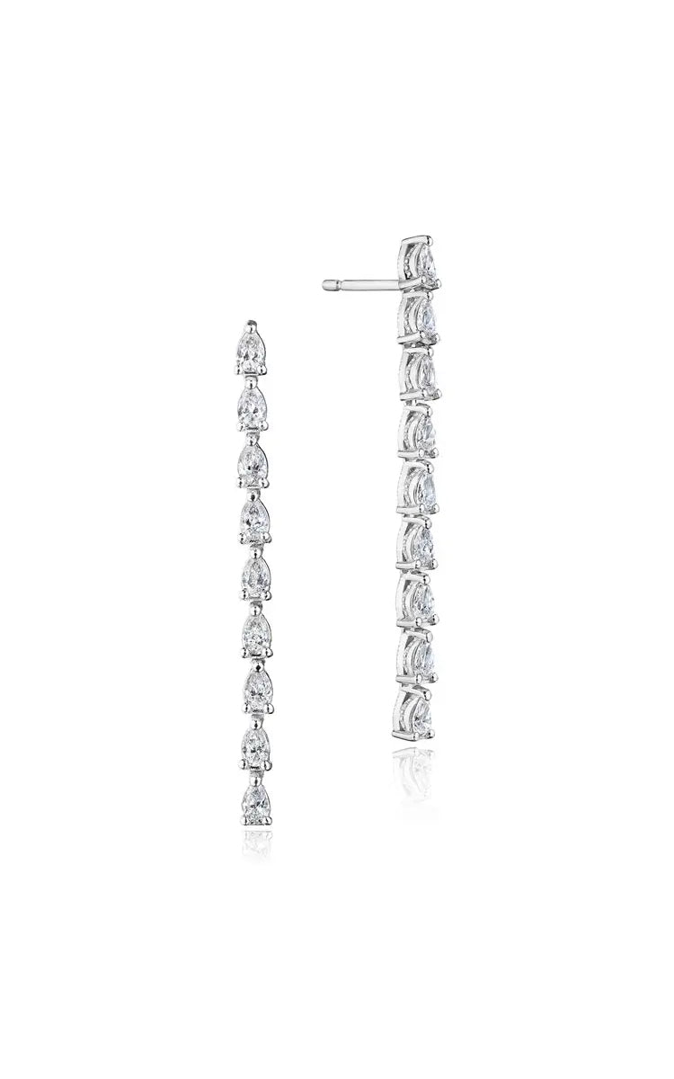 Pear cut diamonds set into 18k White Gold drape gracefully in delicate strings. Milgrain-accented TACORI Crescent detailing embelishes the silhouette.