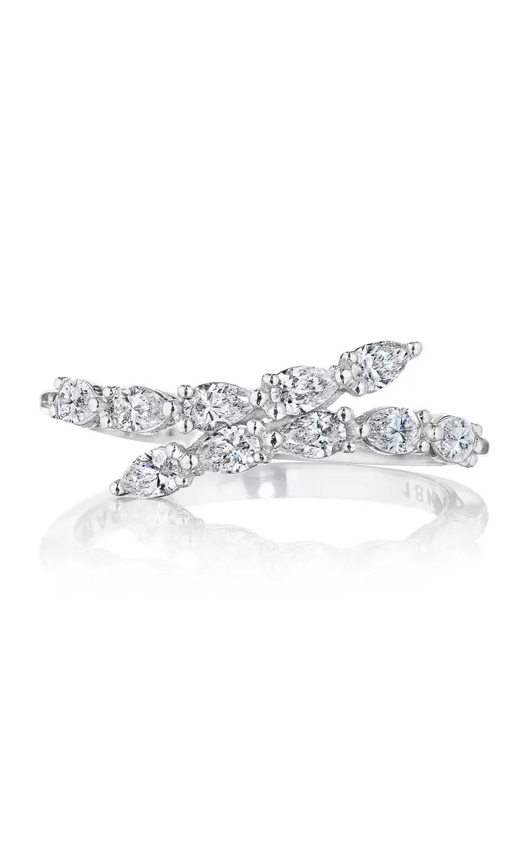 Passing strings of pear cut diamonds are set into a foundation of 18k White Gold. The silhouette of each stone is embellished with milgrain-accented TACORI Crescents.