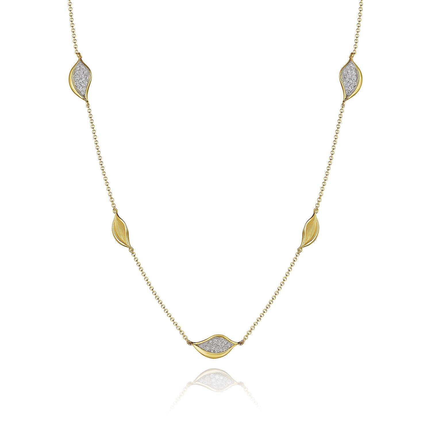 "Larger petal links, inspired by a deconstructed dahlia, anchor this 18k yellow gold station necklace, alternating between pavé and engraved textures."