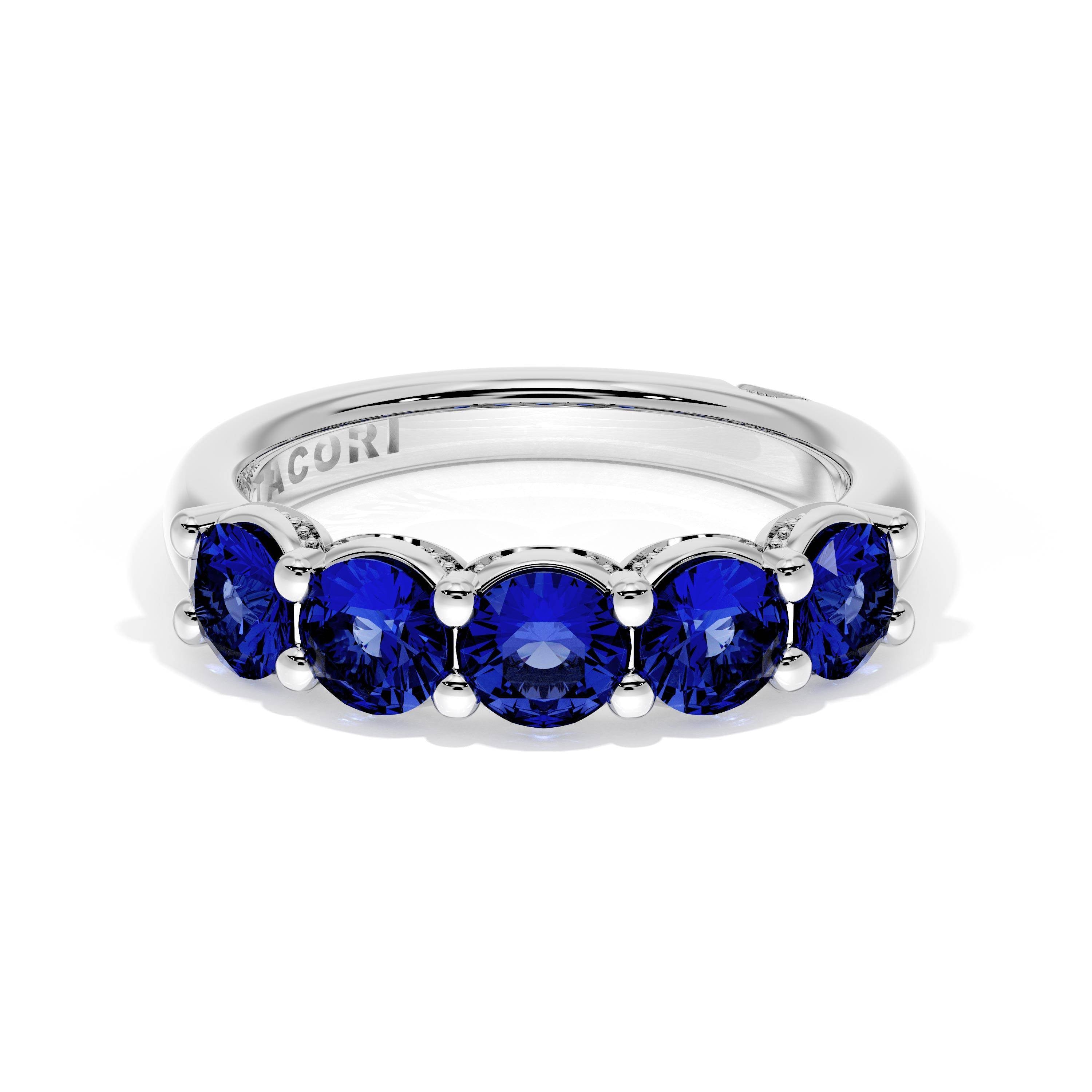 Round cut blue sapphires decorate the ceiling of this Platinum band and milgrain adds intricate texture to the silhouette.