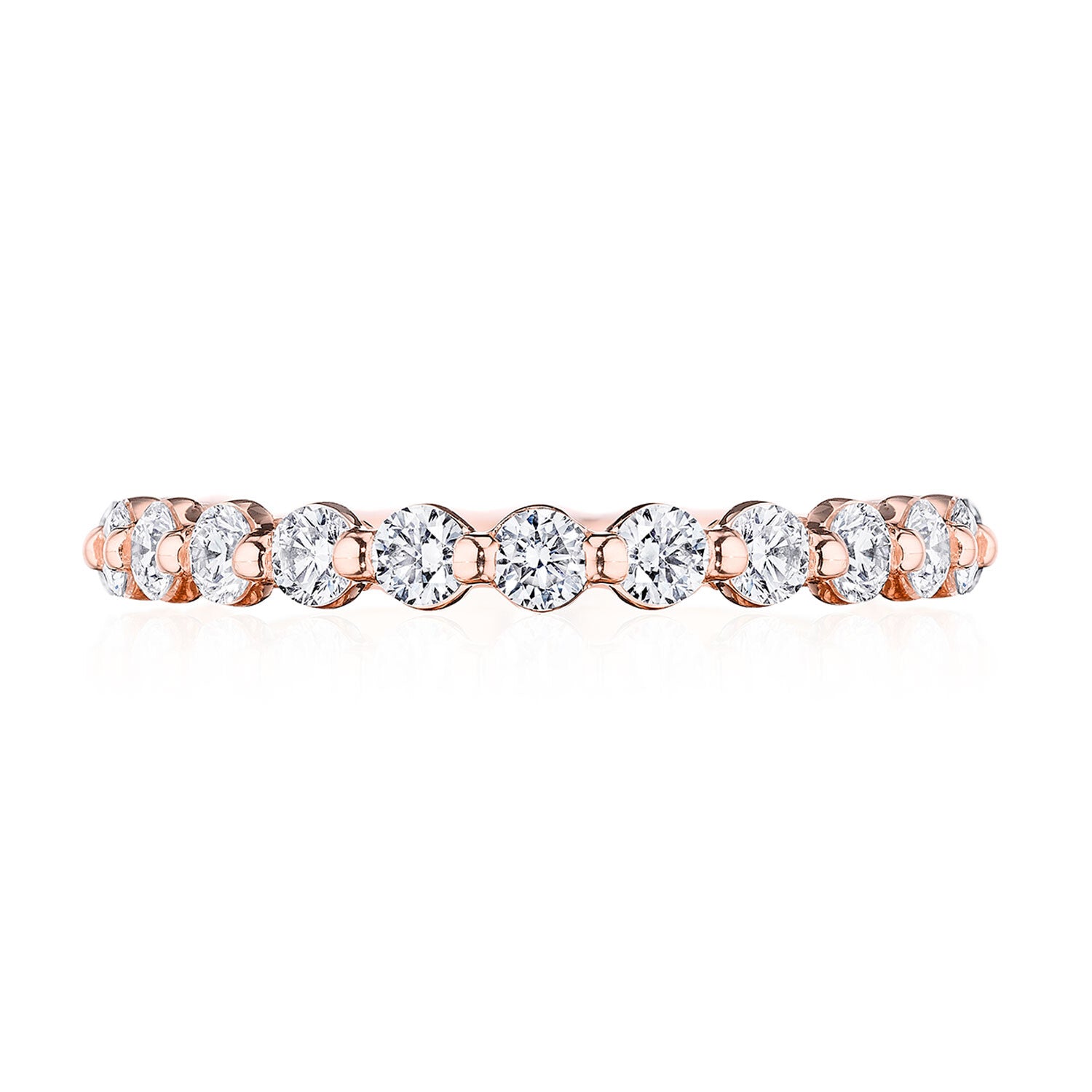 Round brilliant diamonds are bezel set into a high polish 18kt Rose Gold band. Hand-hewn beading adds texture to the inner face silhouette.