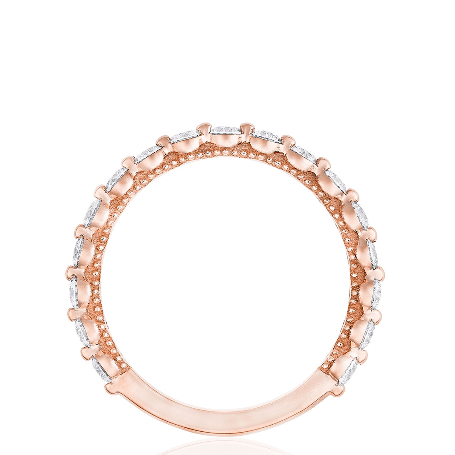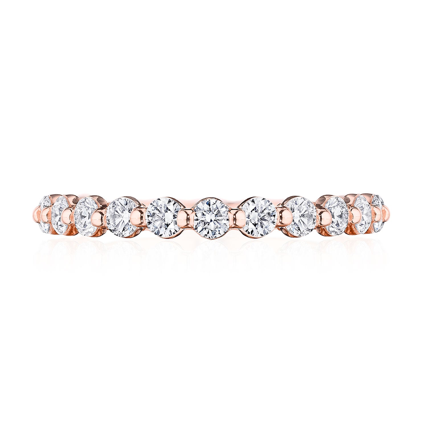 Round brilliant diamonds are bezel set into a high polish 18kt Rose Gold band. Hand-hewn beading adds texture to the inner face silhouette.