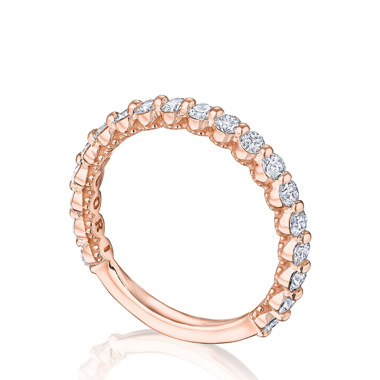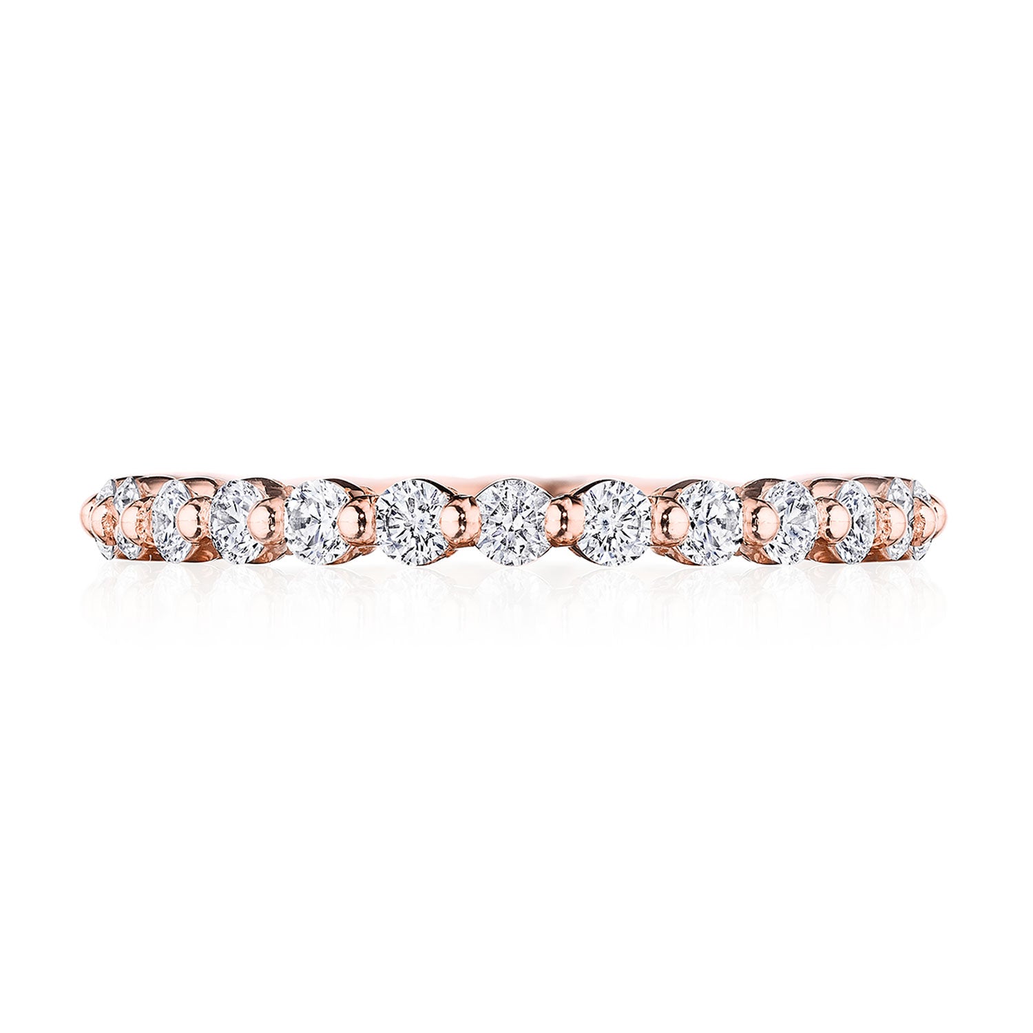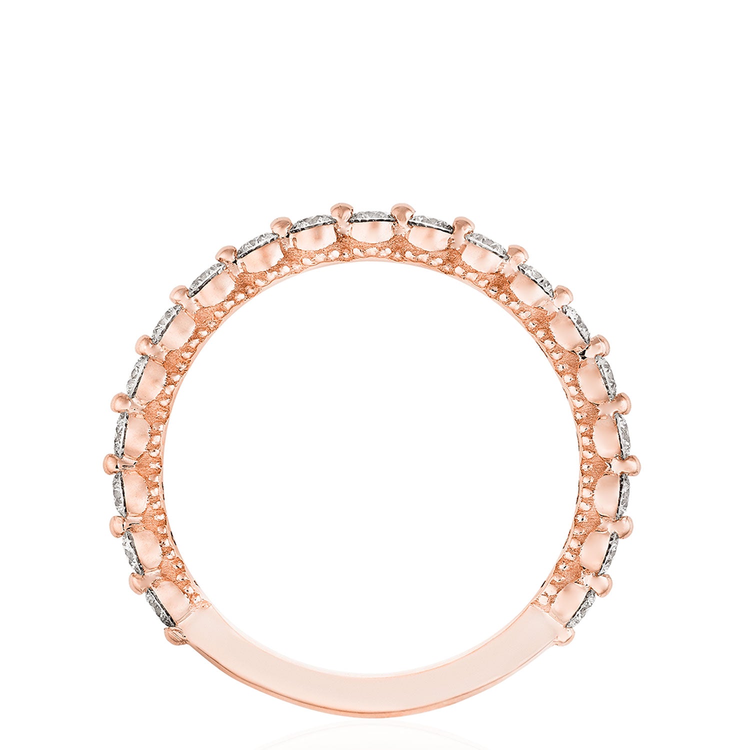 Round brilliant diamonds are bezel set into a high polish 18kt Rose Gold band. Hand-hewn beading adds texture to the inner face silhouette.