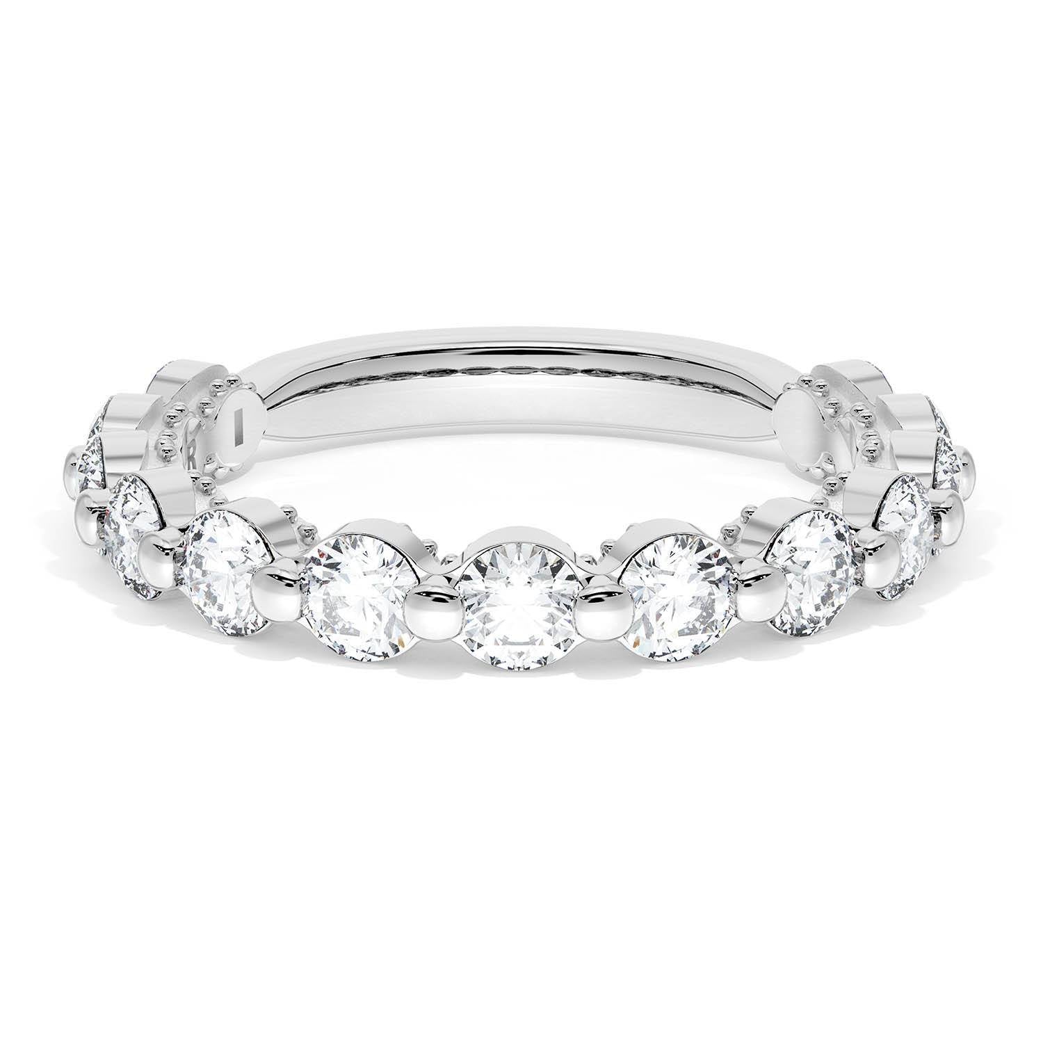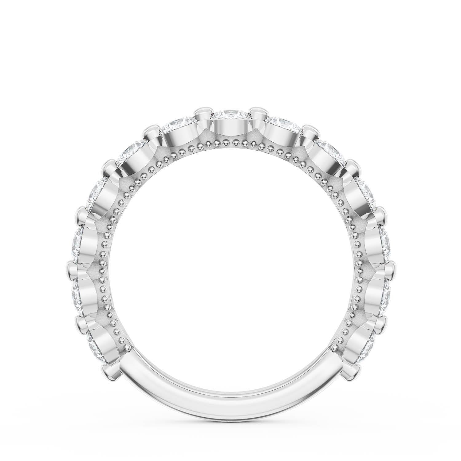 Round brilliant diamonds are bezel set into a high polish Platinum band. Hand-hewn beading adds texture to the inner face silhouette.