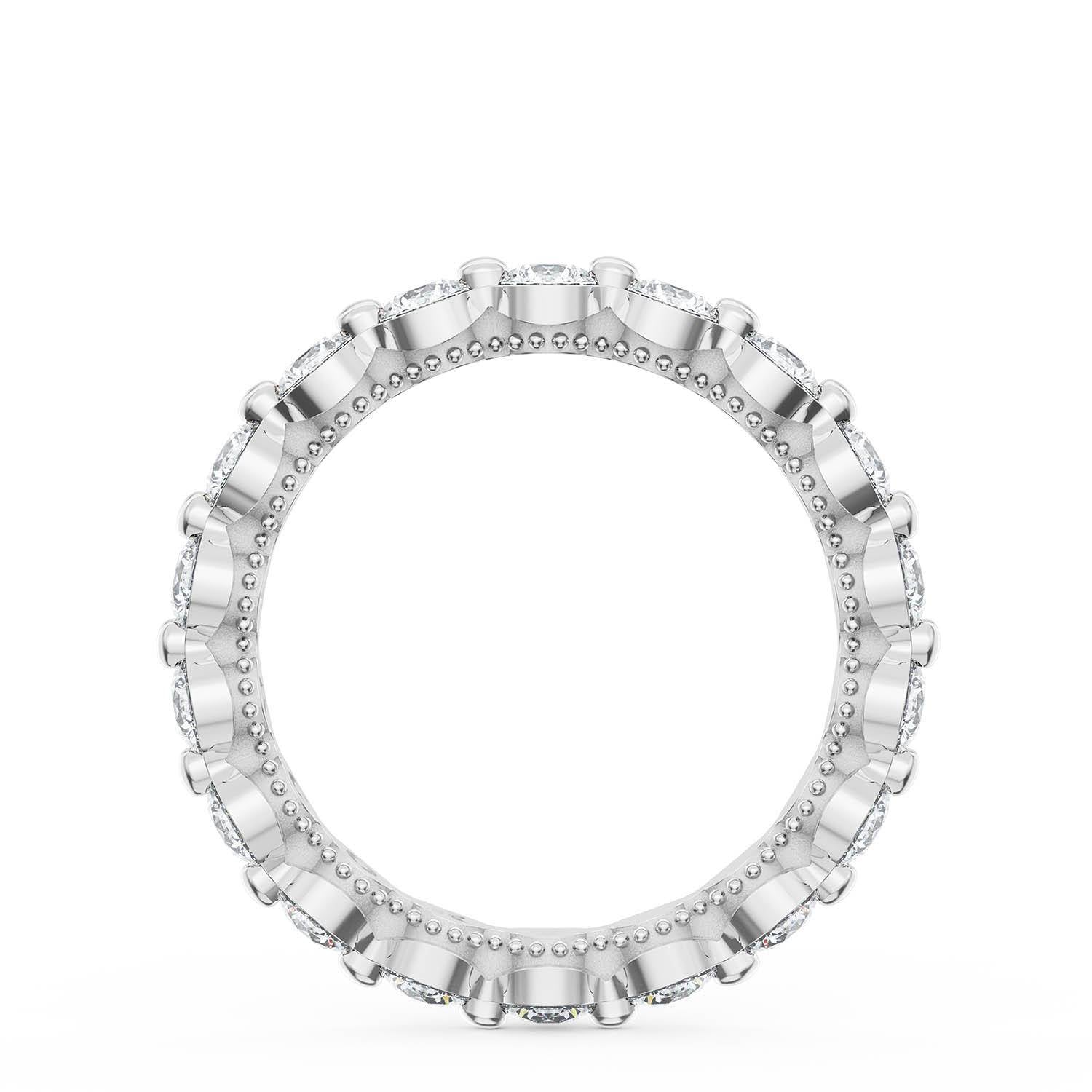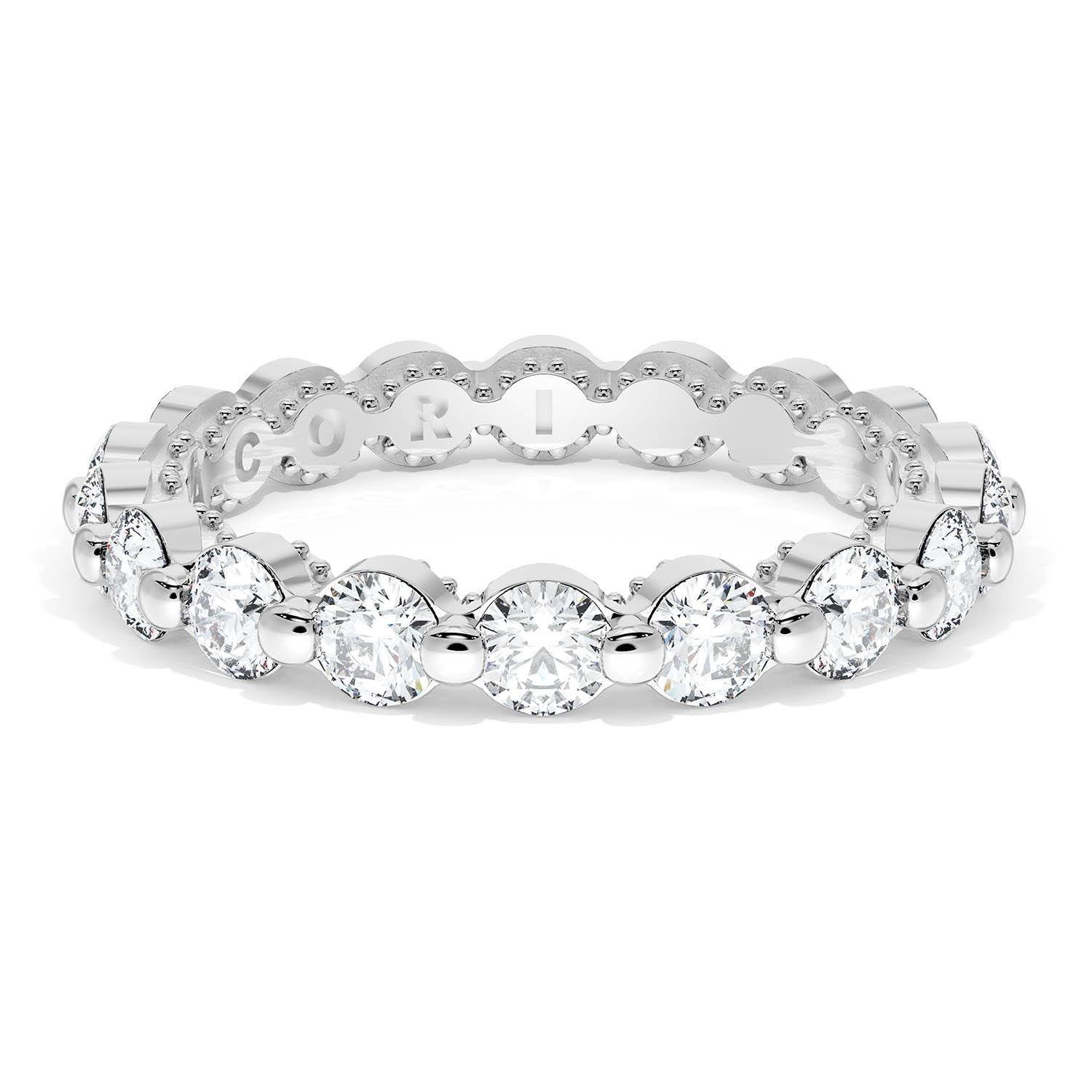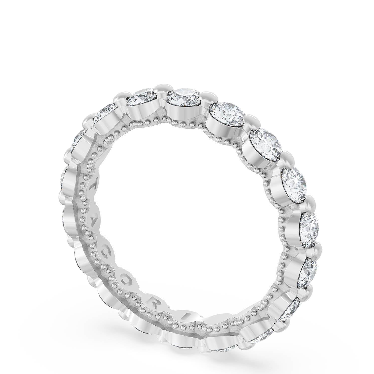 Round brilliant diamonds are bezel set into a high polish 18kt White Gold band. Hand-hewn beading adds texture to the inner face silhouette.