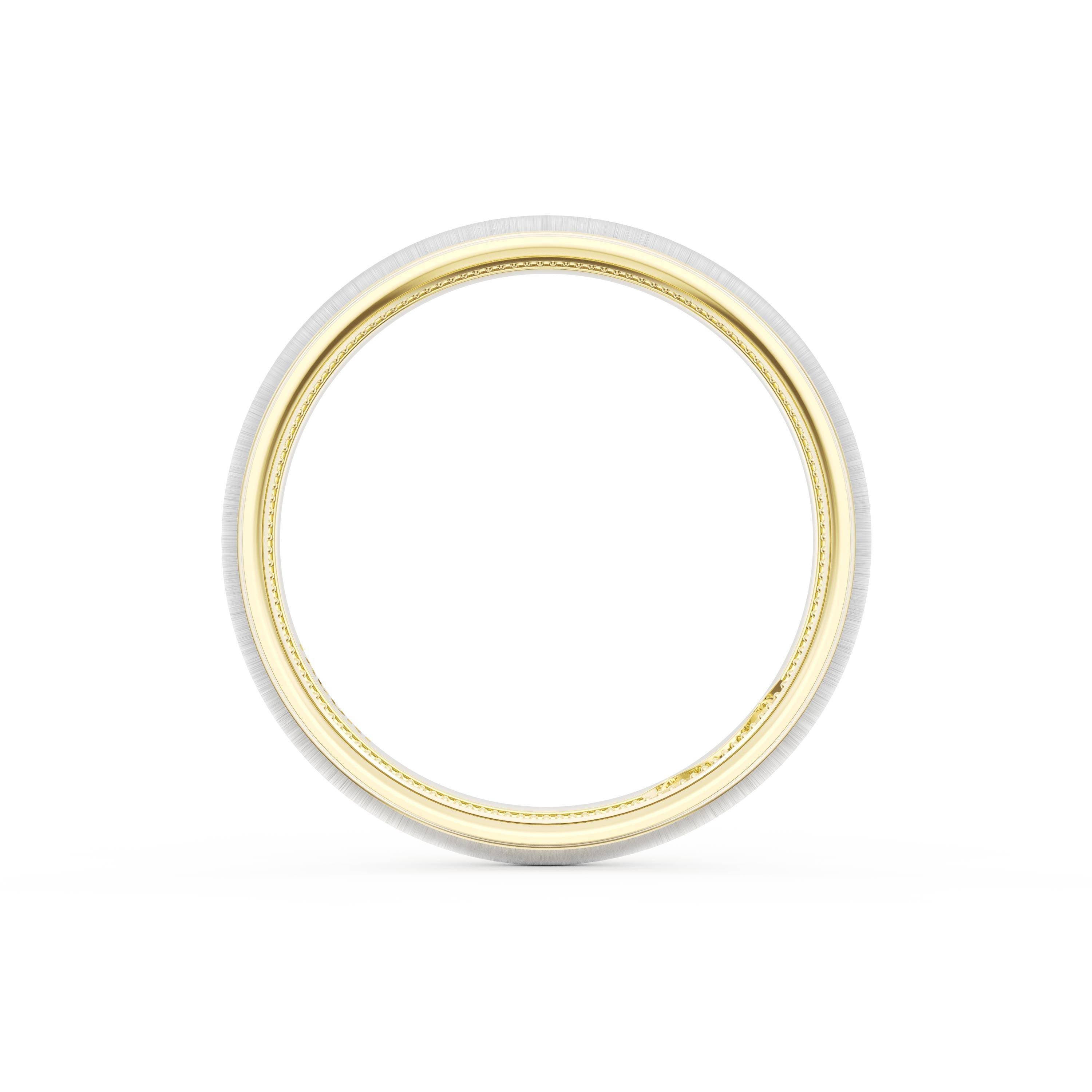 This two tone band of 18kt Yellow Gold & Platinum features a gently rounded ceiling with a satin finish and milgrain detailing on the inner face.