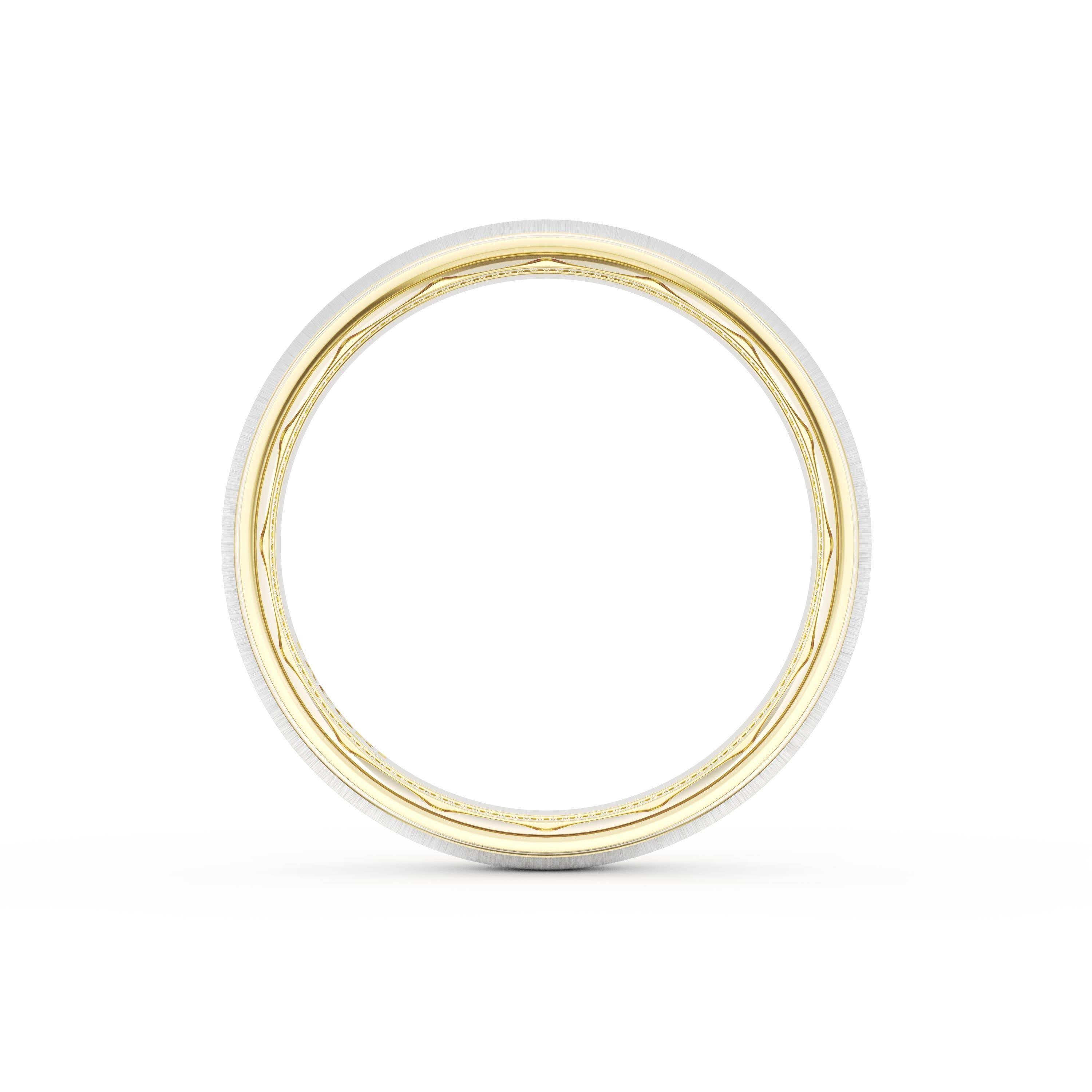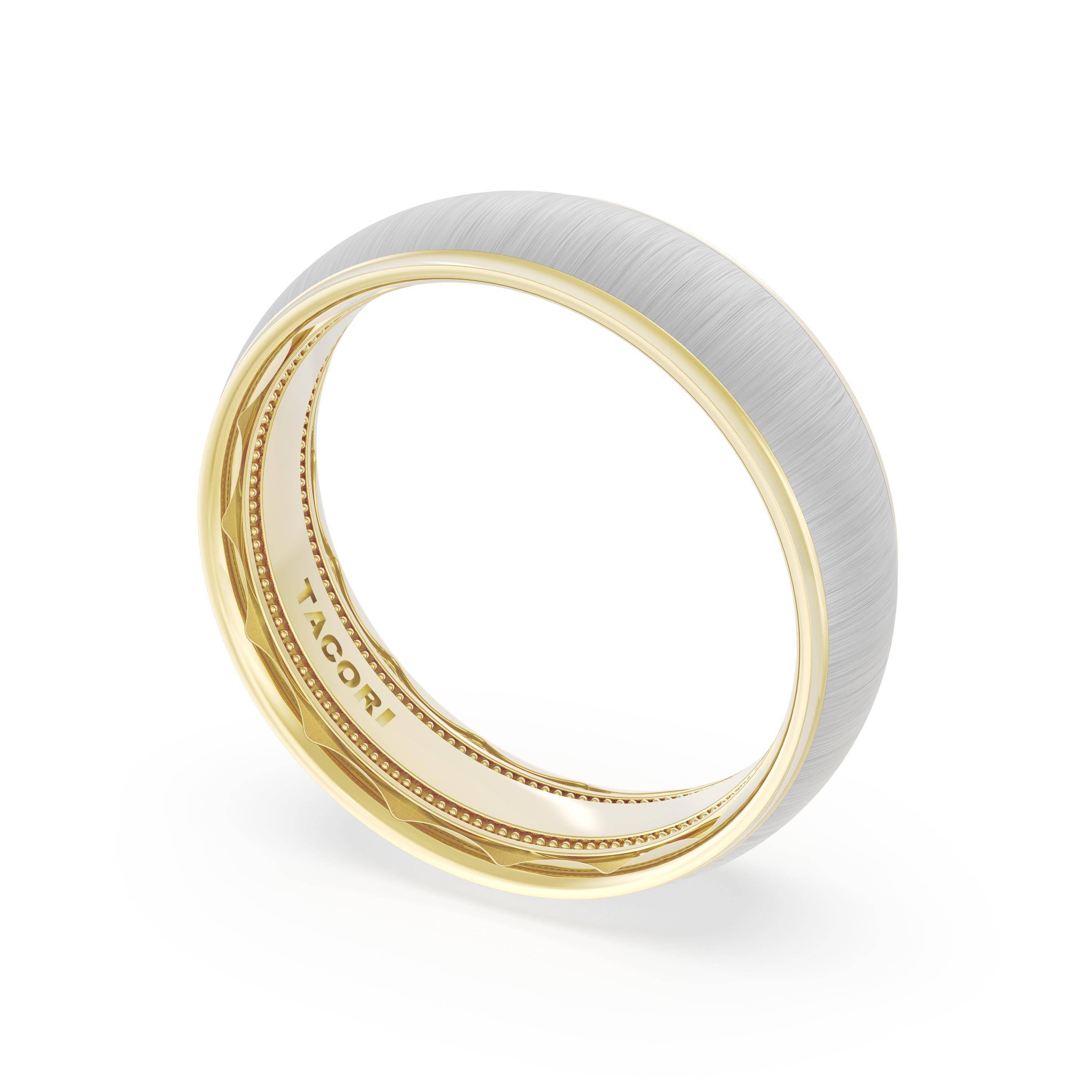 This two tone band of 18kt Yellow Gold & Platinum features a gently rounded ceiling with a satin finish and milgrain detailing on the inner face.