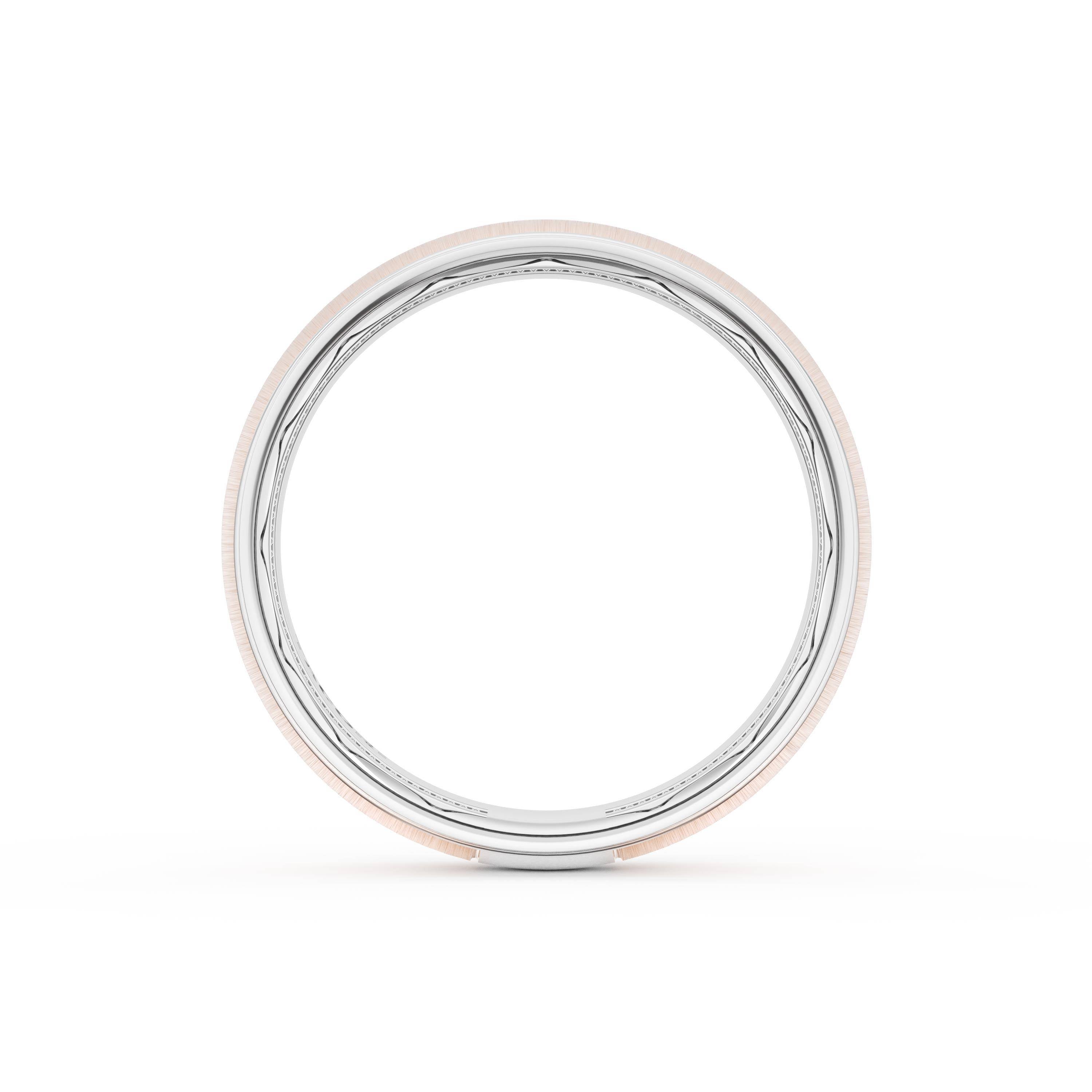 This two tone band of Platinum & 18kt Rose Gold features a gently rounded ceiling with a satin finish and milgrain detailing on the inner face.