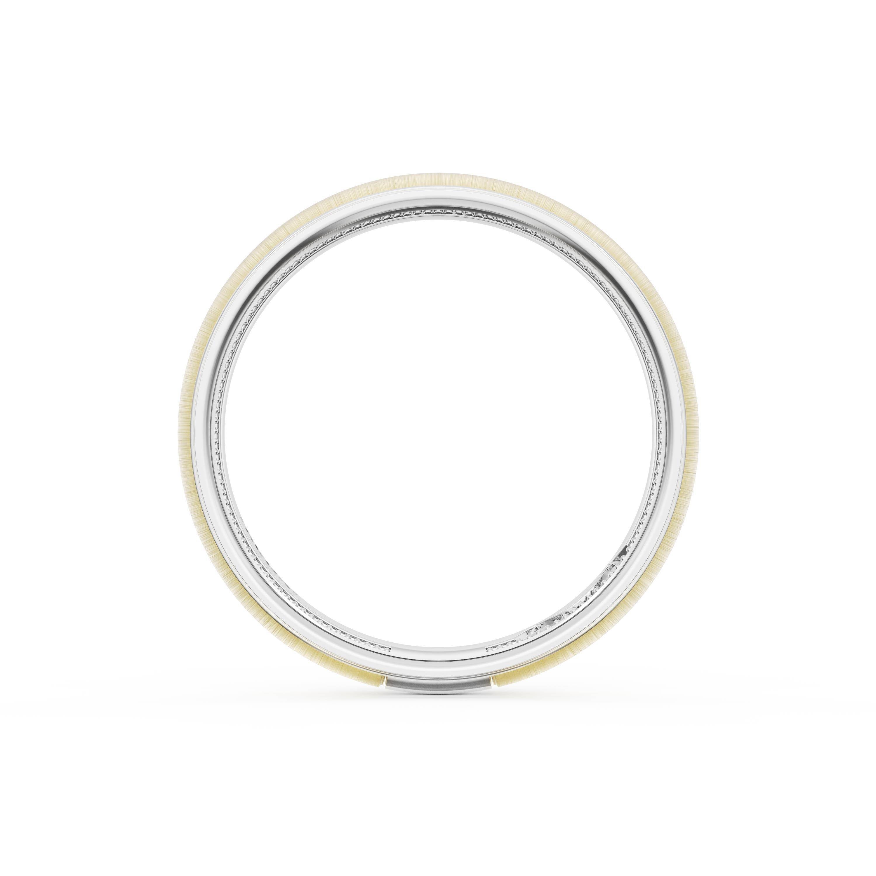 This two tone band of Platinum & 18kt Yellow Gold features a gently rounded ceiling with a satin finish and milgrain detailing on the inner face.