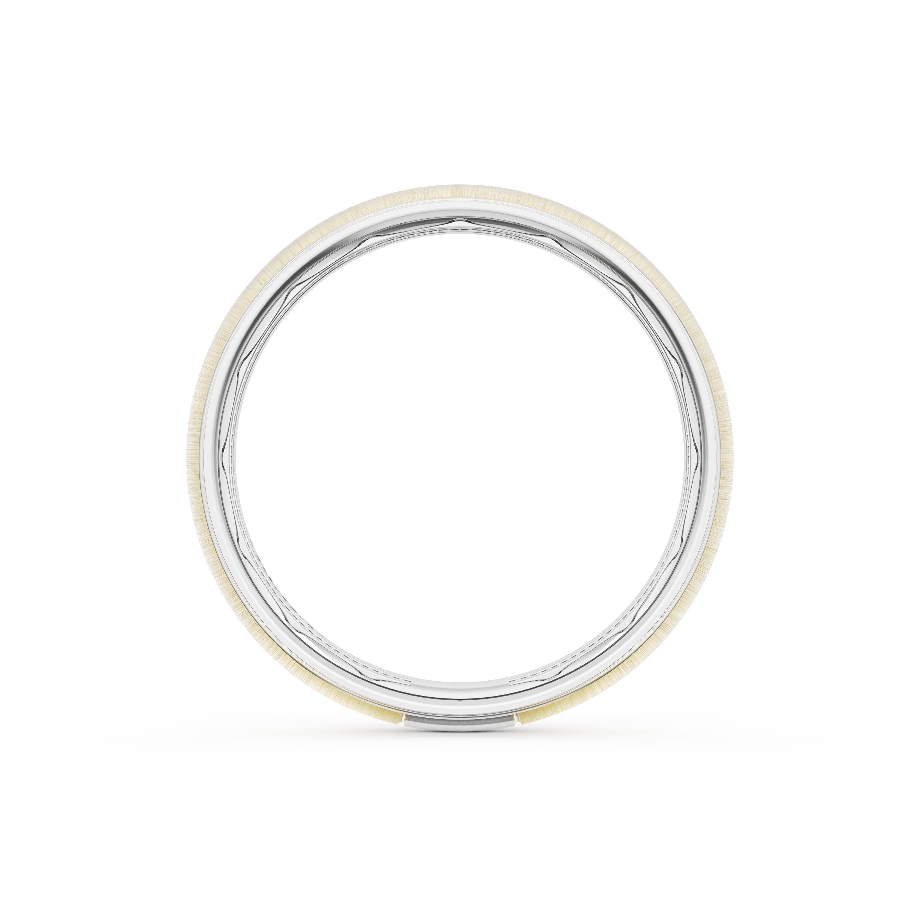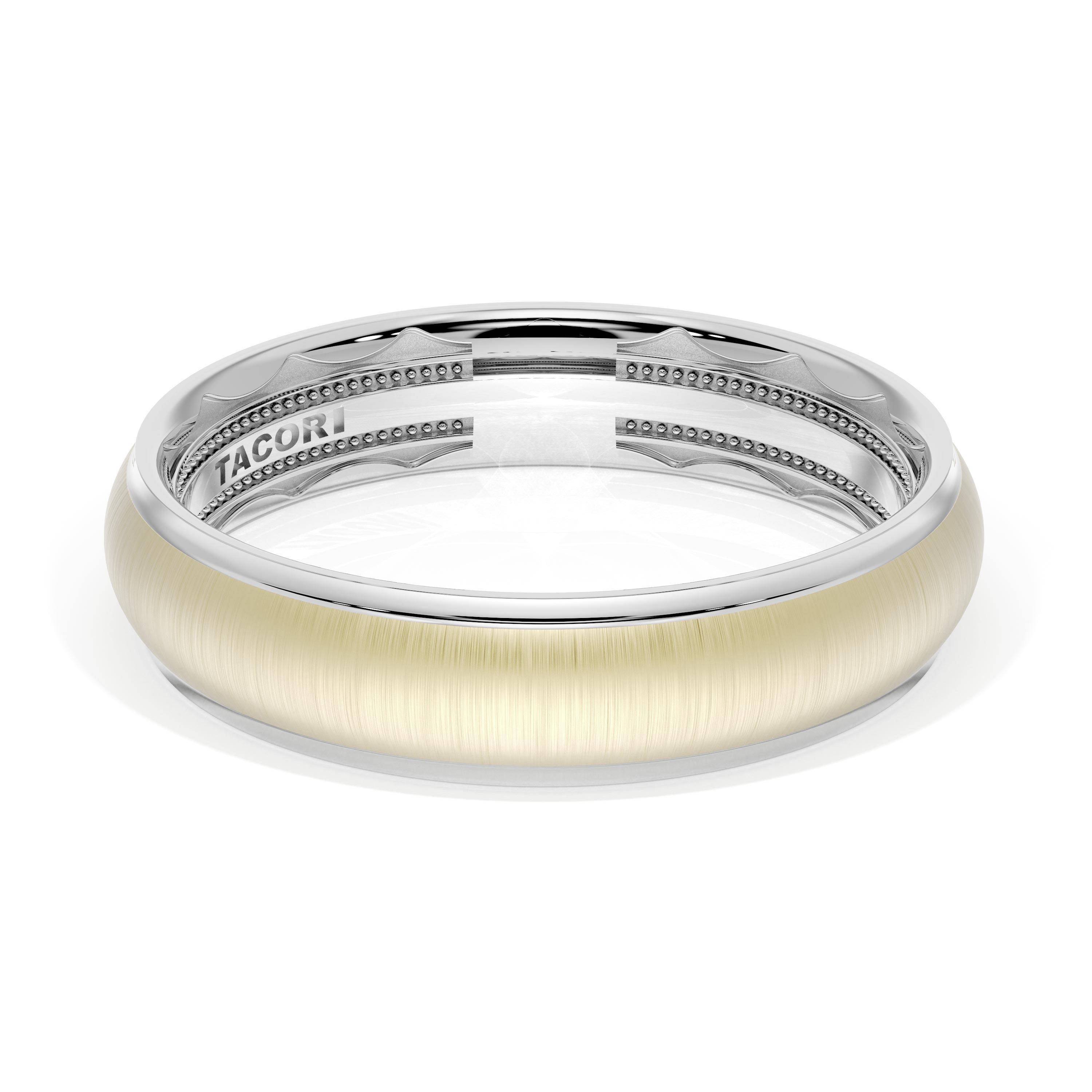 This two tone band of Platinum & 18kt Yellow Gold features a gently rounded ceiling with a satin finish and milgrain detailing on the inner face.