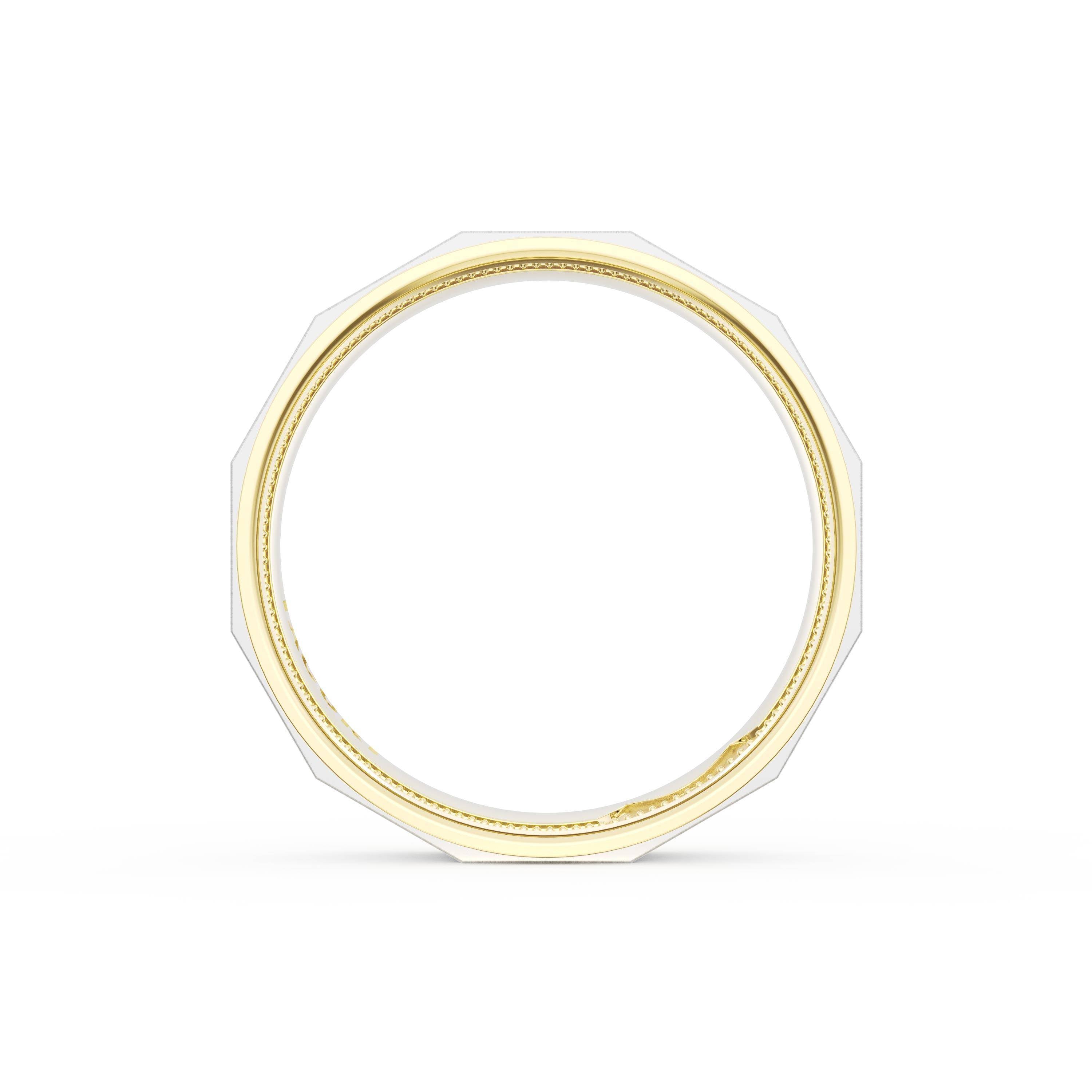 This two tone band of 18kt Yellow Gold & Platinum features a geometric ceiling with a satin finish and milgrain detailing on the inner face.
