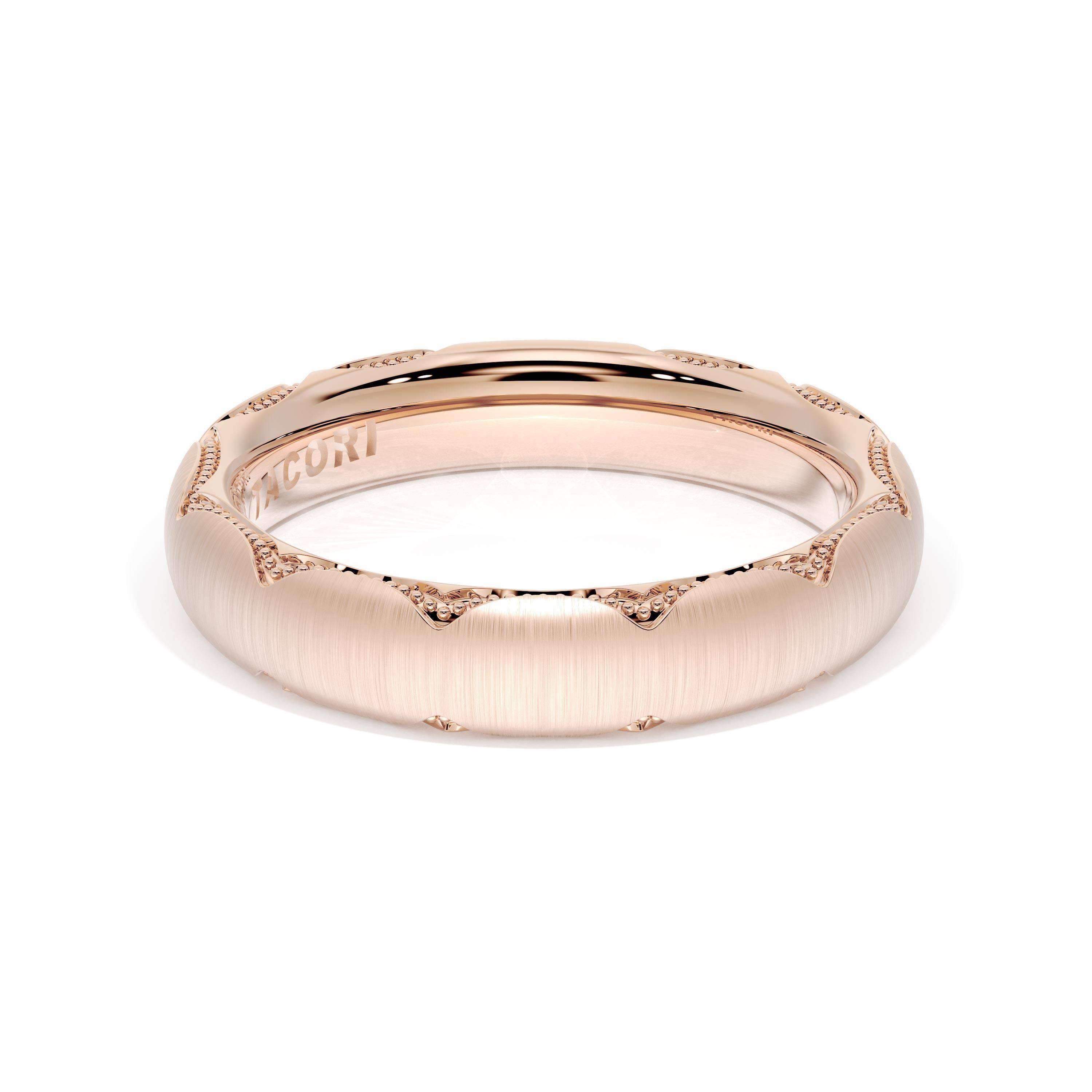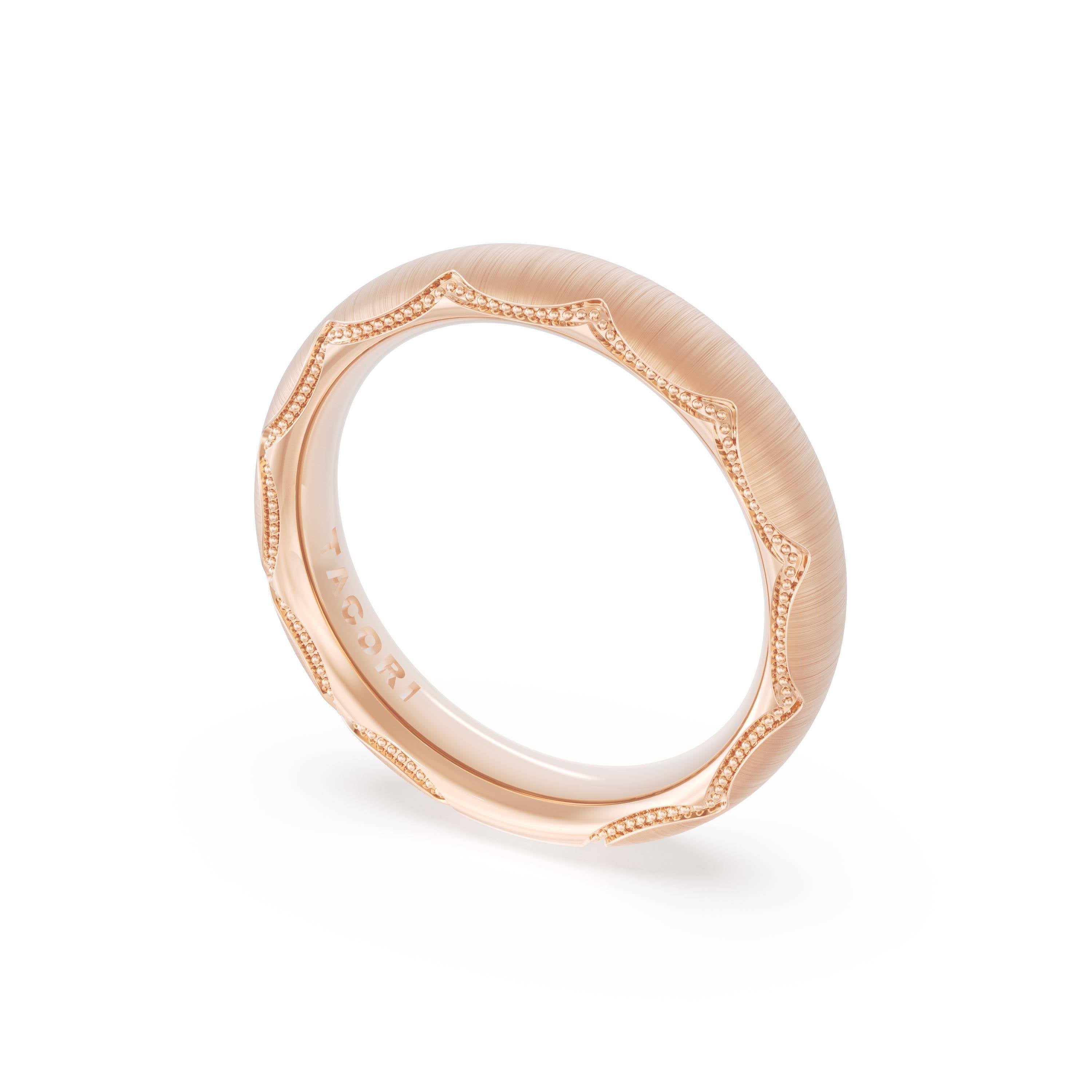 This bold and modern cigar-style 18K Rose Gold band with clean lines gets a touch of texture from milgrain Crescent detailing on the silhouette.