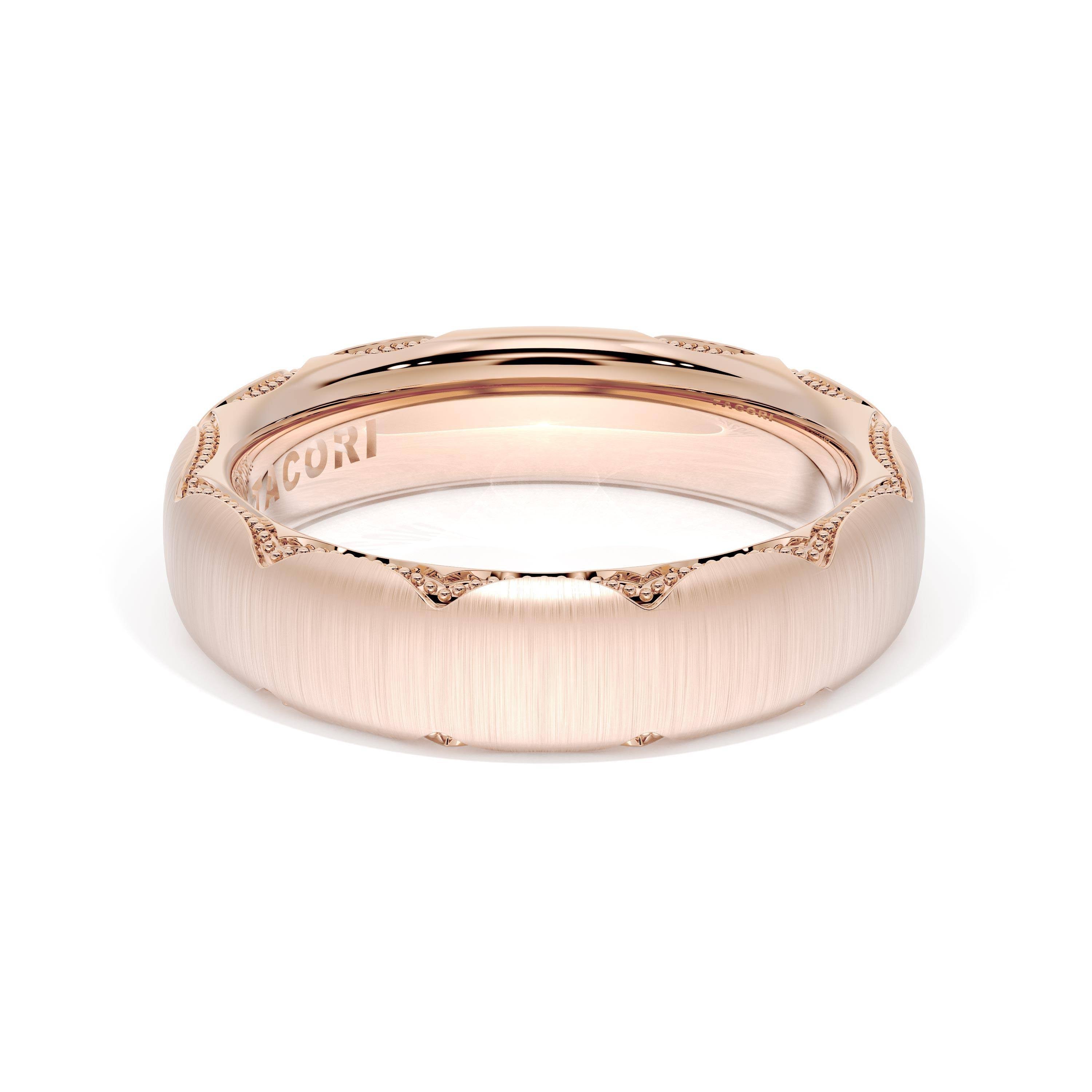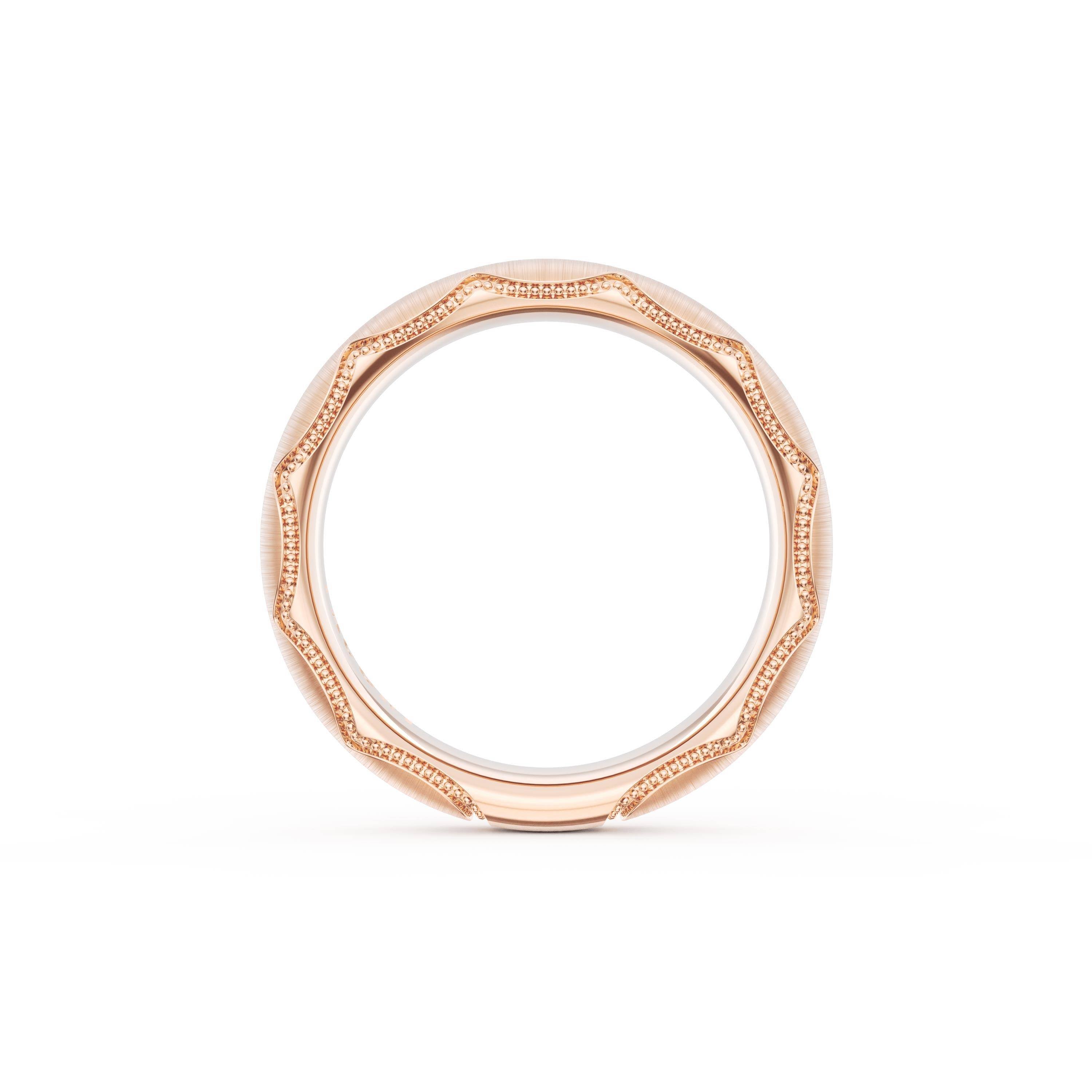 This bold and modern cigar-style 18K Rose Gold band with clean lines gets a touch of texture from milgrain Crescent detailing on the silhouette.