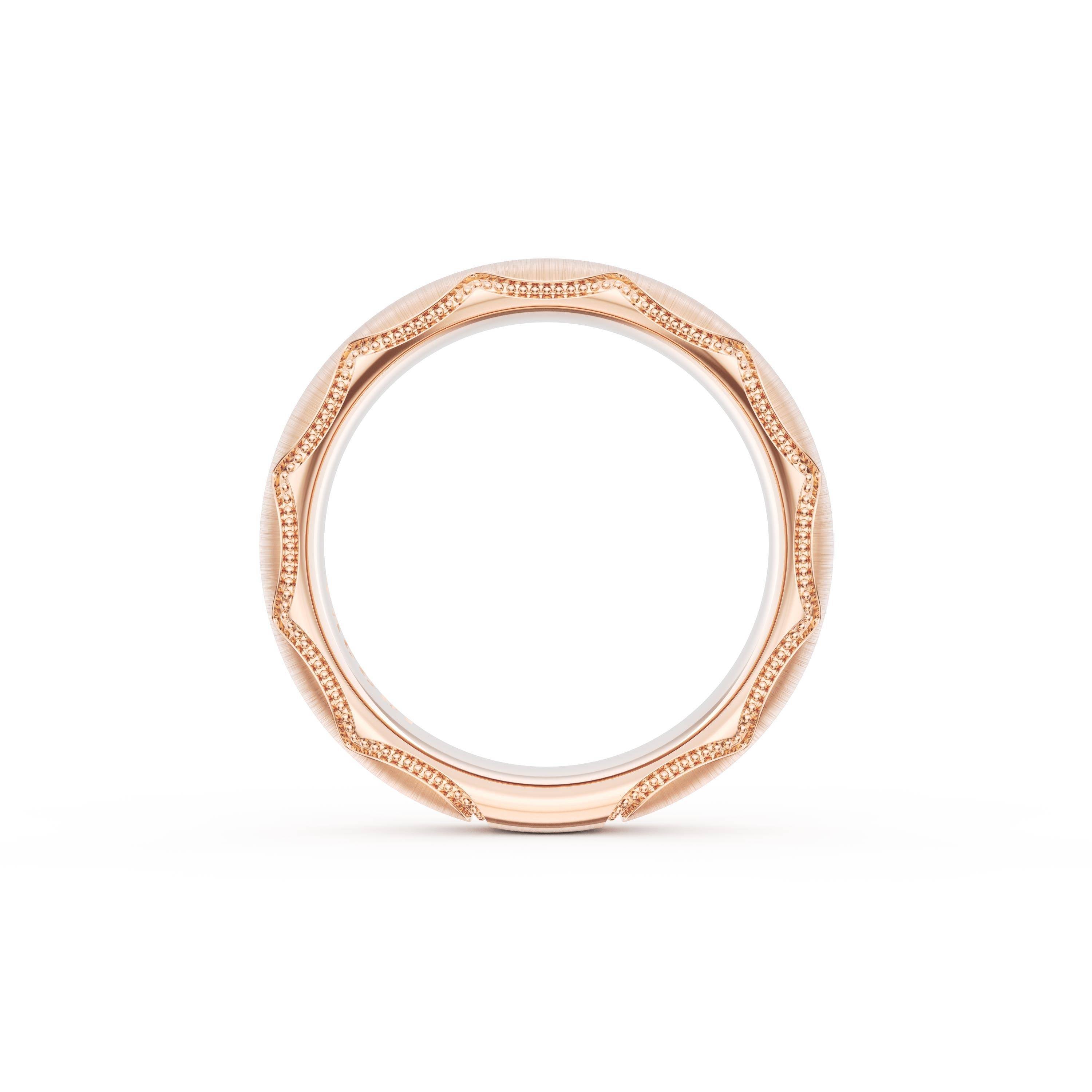 This bold and modern cigar-style 18K Rose Gold band with clean lines gets a touch of texture from milgrain Crescent detailing on the silhouette.