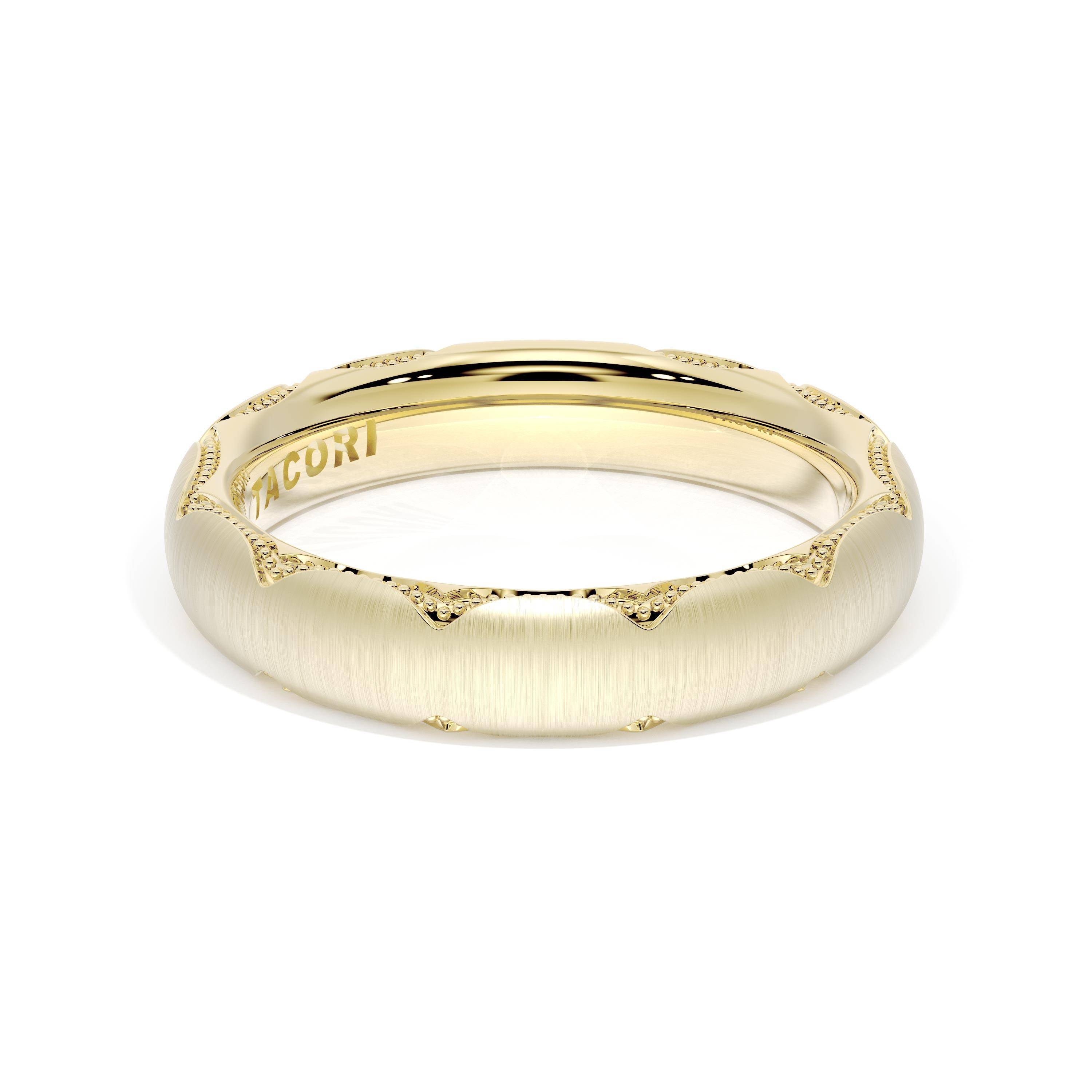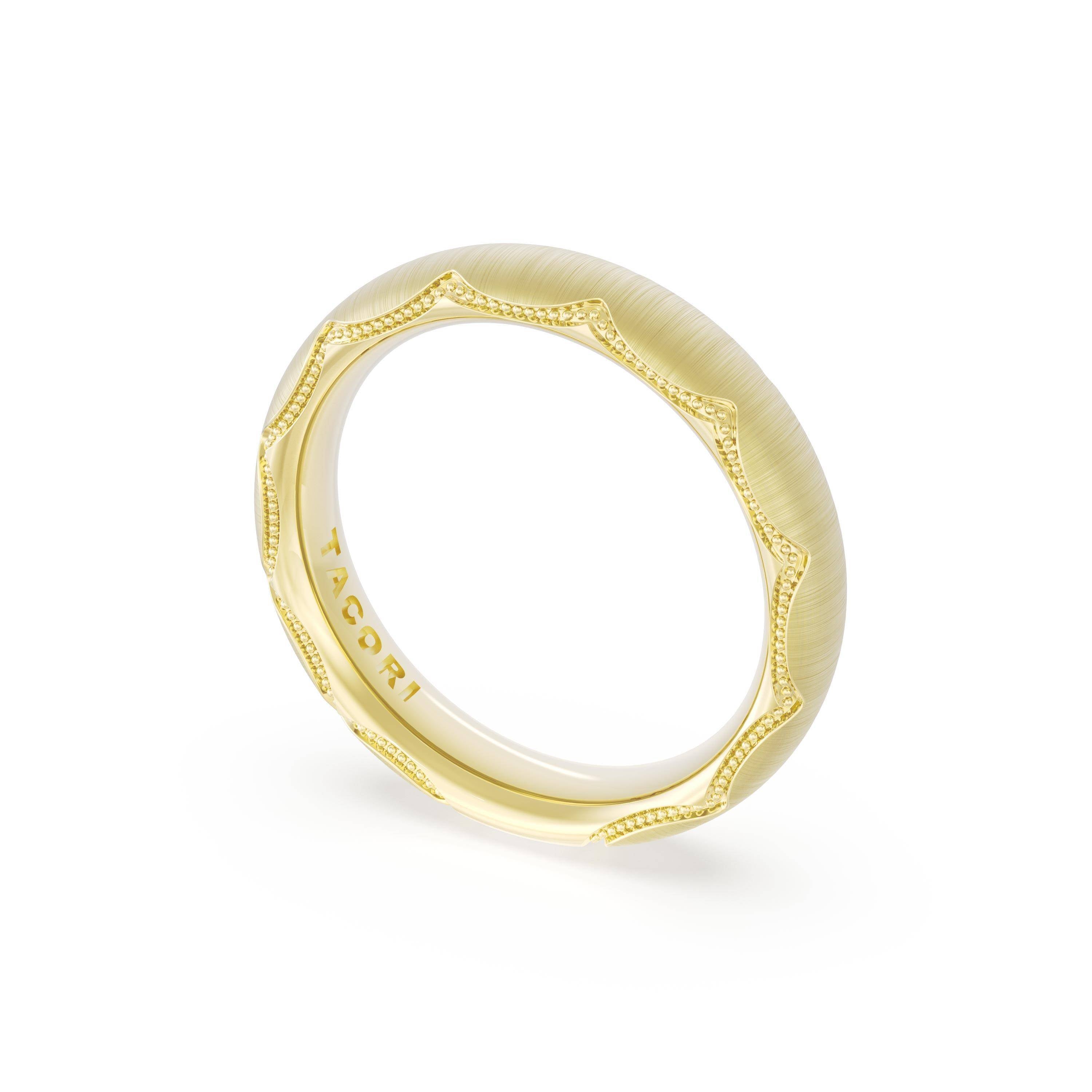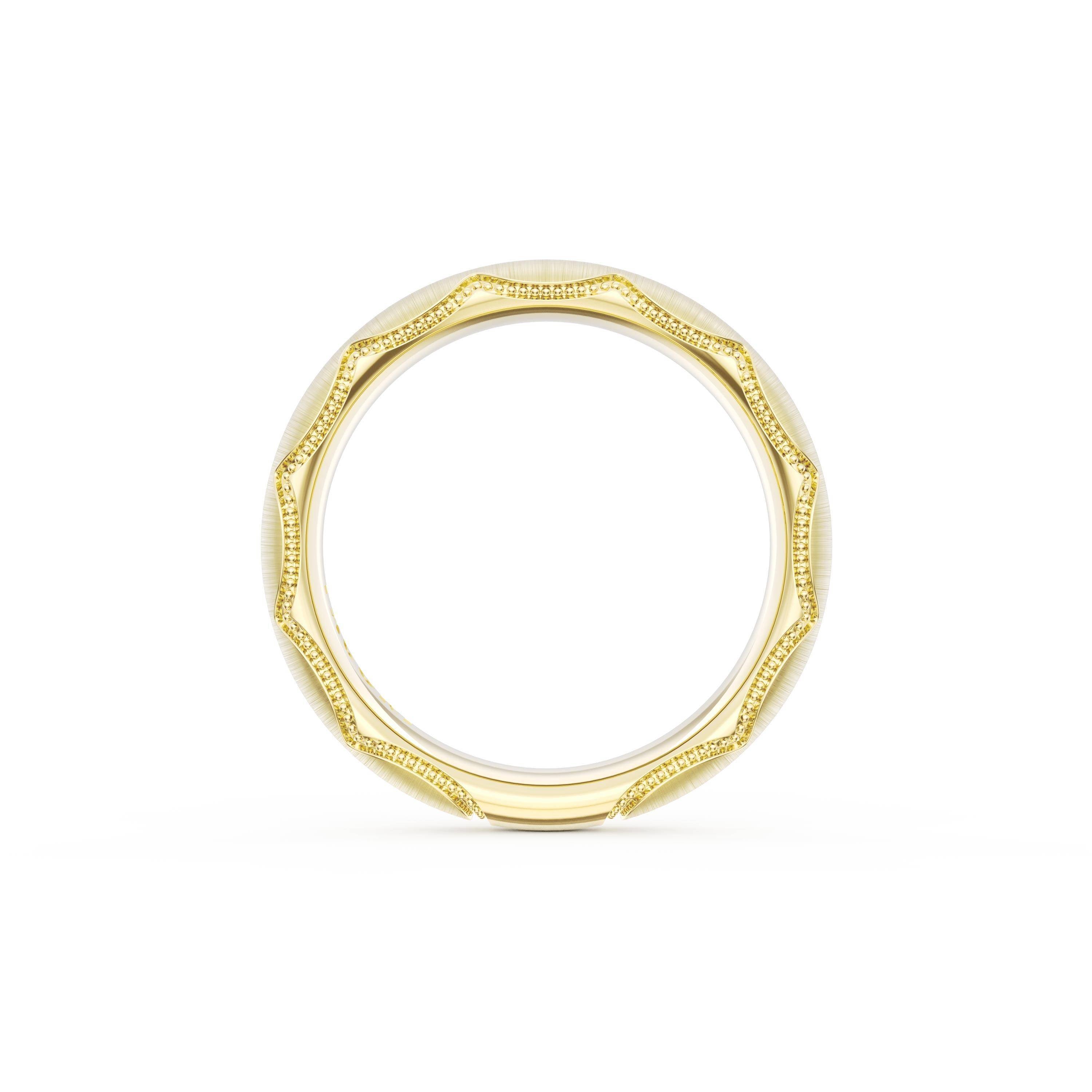 This bold and modern cigar-style 18K Yellow Gold band with clean lines gets a touch of texture from milgrain Crescent detailing on the silhouette.