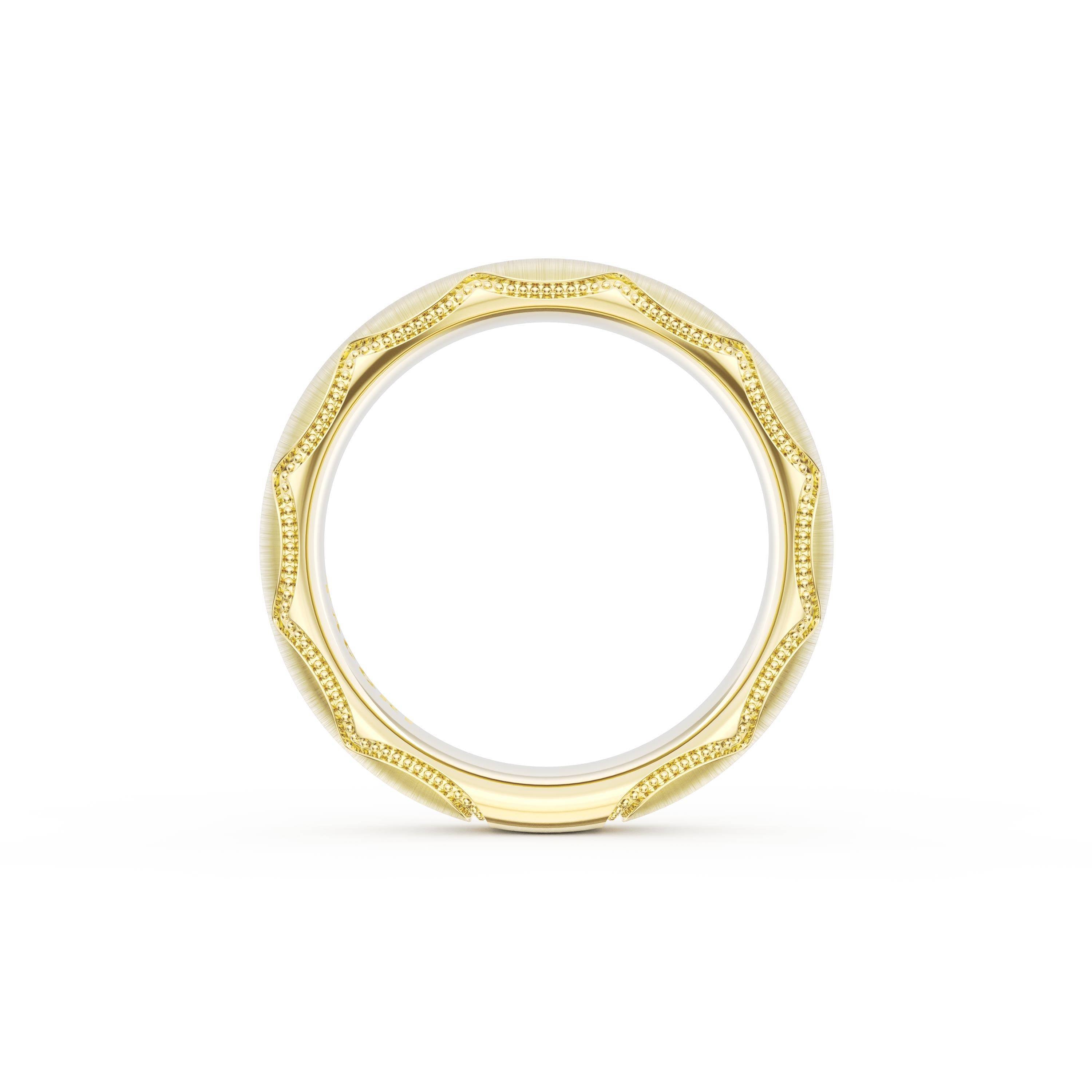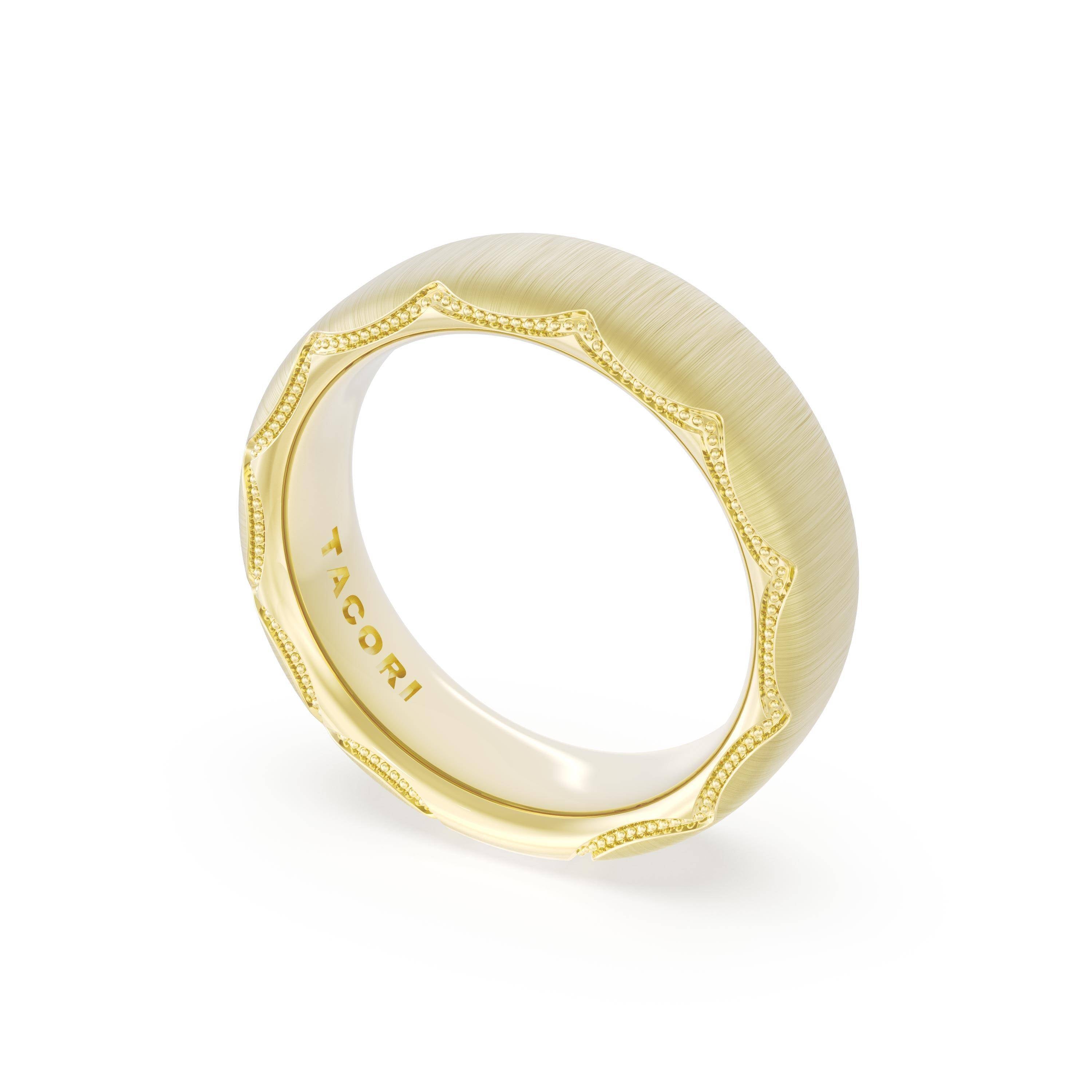 This bold and modern cigar-style 18K Yellow Gold band with clean lines gets a touch of texture from milgrain Crescent detailing on the silhouette.