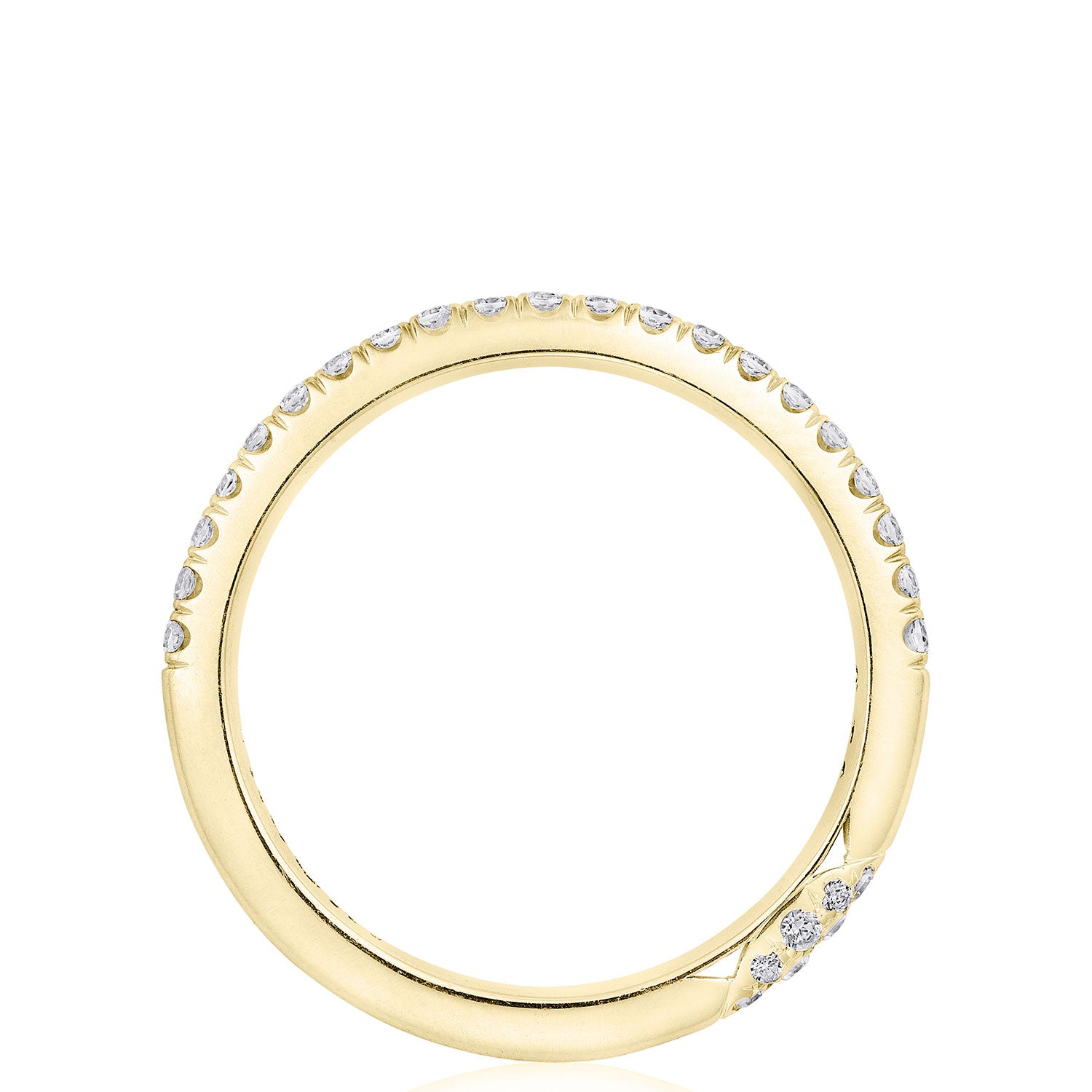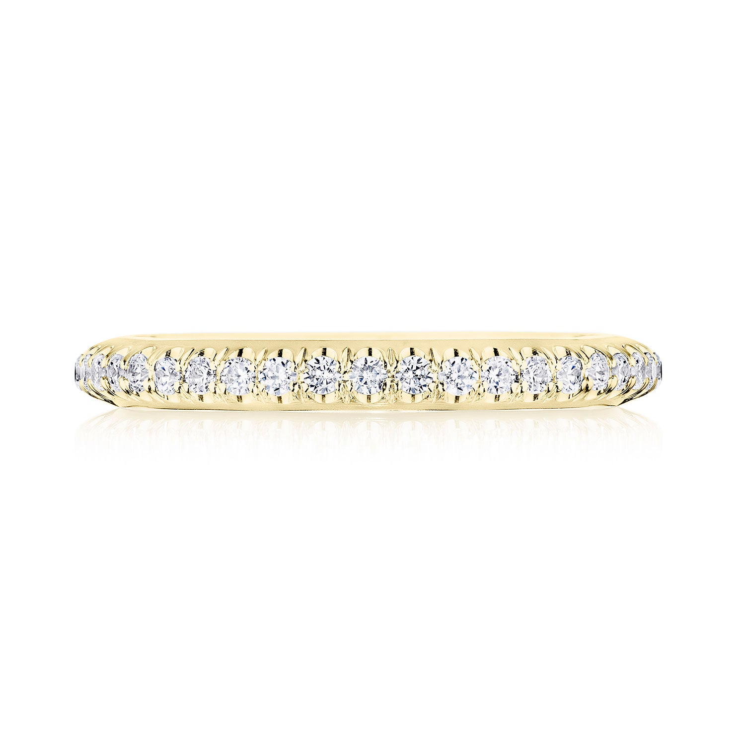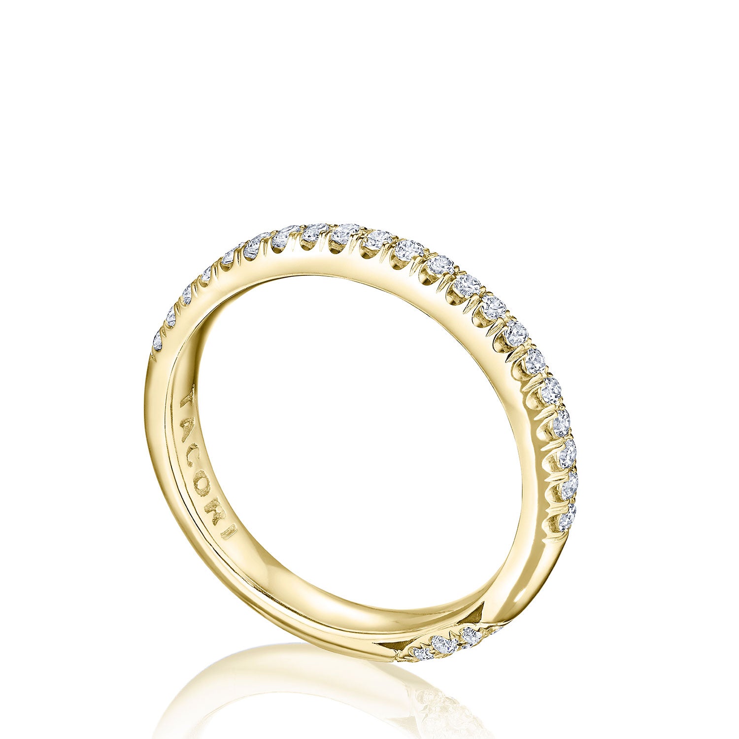 "Designed by our Founder, Haig Tacorian, this wedding band features a single row of pavé-set diamonds, half-way around the band. Discover the diamond-intense Tacori crescent signature."