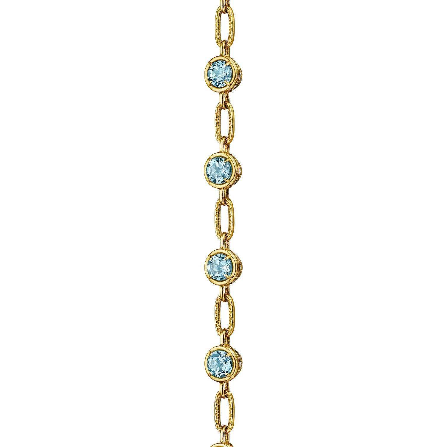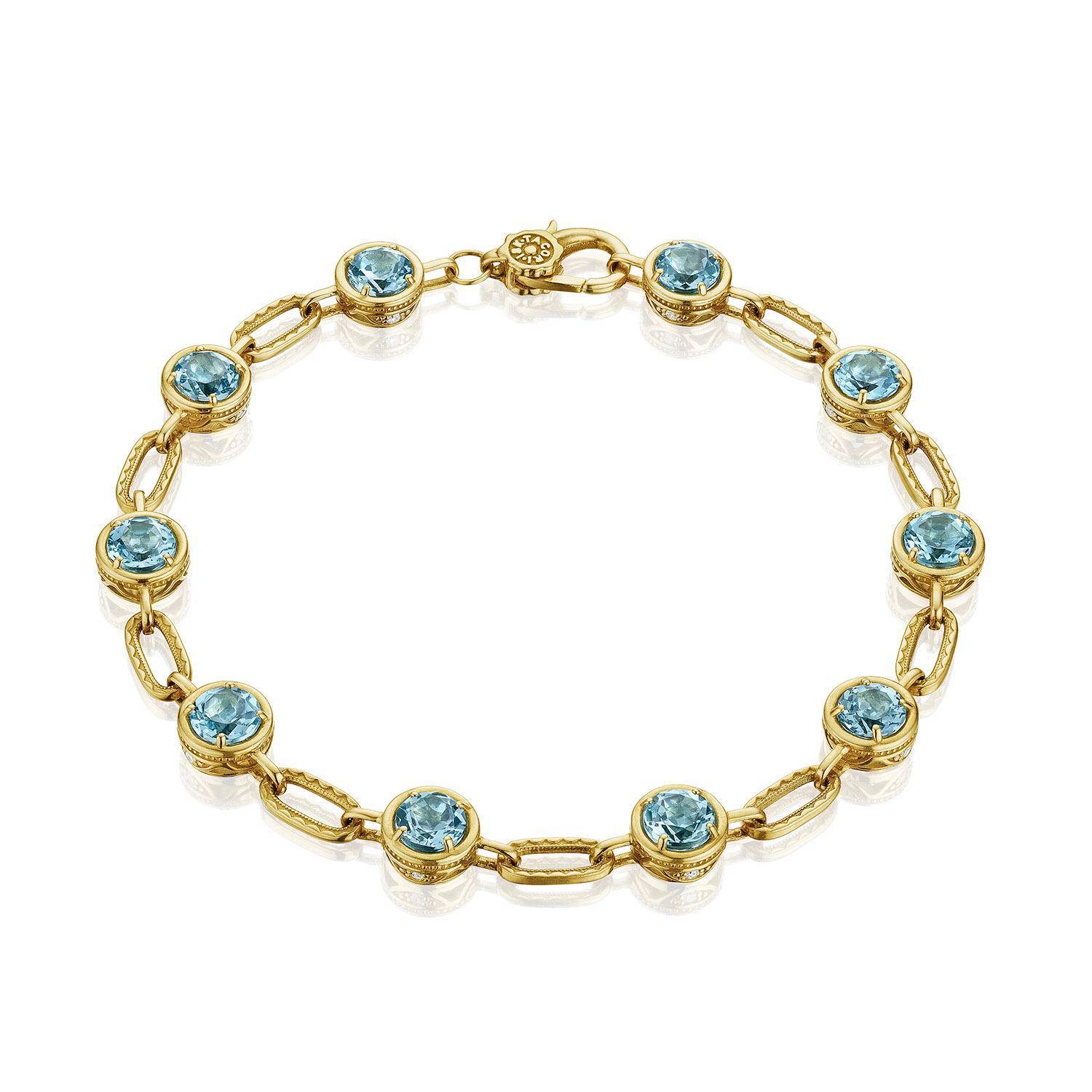 "High polish frames enthrall Sky Blue Topaz centers, while on the reverse, meticulous hidden details and pinpoint mined diamonds add dimensional sparkle. Hand-hewn Crescent-embellished links connect each bezel setting."