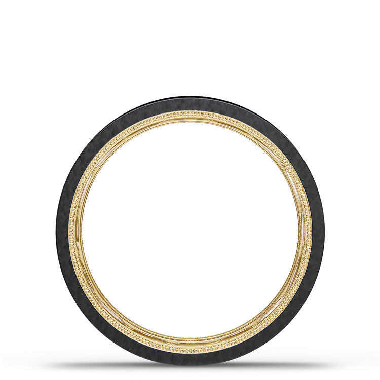 "The ceiling and inner face silhouette of two metals, Black Titanium and 18kt Yellow Gold, make for an eye-catching tone-on-tone contrast. The inner face is decorated with hand-hewn milgrain, beading, and TACORI Crescent detailing. Rings are available in full and half sizes from 6-12."